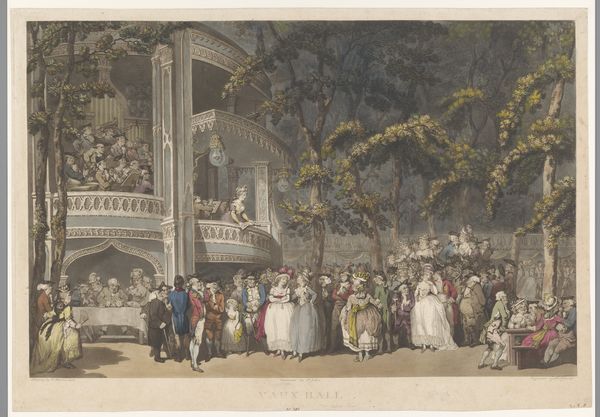 Curator: What we have here is Robert Pollard's "Vauxhall Gardens in London," an engraving from 1785. It really offers us a glimpse into a world gone by. Editor: It feels overwhelmingly populated, doesn’t it? Everyone primped and preened and crammed together. A fancy, outdoor ant farm! Curator: Vauxhall Gardens was a huge public attraction, a commercial venture aimed at everyone, mixing classes. That's reflected in the image, a space buzzing with people wanting entertainment and to see and be seen. Editor: I wonder what those melodies drifting from the orchestra sound like. Are people genuinely enraptured by the music or are they mostly there to show off their latest silks and feathered hats? It feels performative even without the stage. Curator: Exactly! It was as much about social networking as artistic appreciation, like a Georgian version of a bustling town square. Note the architecture too—those playfully ornate pavilions offered more than just shelter; they symbolized a cultured society. Editor: But there's something bittersweet here too. The artificial lighting, those pruned trees… it's nature manicured and controlled. Is it paradise or just a gilded cage? Even in ‘nature,’ the people seem to abide by rules! Curator: Good eye! The gardens walked a fine line, offering natural retreat, while reinforcing social decorum and even promoting the power structure. Those architectural boxes within boxes mimic the rigid hierarchical boundaries within 18th-century London society. Editor: It makes me wonder if the promise of escape and the joy are a thin veil. Maybe the etching's black and white enhances that…there’s no denying there's a definite lack of colour! Curator: Certainly. Pollard has captured a fascinating microcosm. His image lets us ponder the interplay of nature, culture, and the carefully constructed performance that defined that particular time and place. Editor: So next time you feel like hiding away in a public garden, maybe remember all the politics and artistry woven into what seems like an innocent walk in the park.