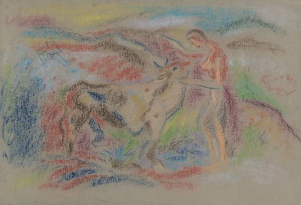 Editor: This is William Blake's "Beatrice Addressing Dante from the Car." The watercolor feels otherworldly and a bit unsettling with its pale figures. What compositional elements stand out to you? Curator: The swirling vortex dominates, acting as a fulcrum against the rectilinear geometry of the figures and griffin. Note the strategic placement of eyes; they are not merely representational but structural, guiding our gaze. Editor: It's a bit unnerving, all those eyes! Curator: Indeed, consider the contrast between the static, idealized figures and the dynamic, almost chaotic, vortex. How does that tension inform your understanding? Editor: It makes me think about the contrast between the earthly and the divine. Thanks, that gives me a lot to consider. Curator: My pleasure; such formal tensions are central to Blake's visionary language.