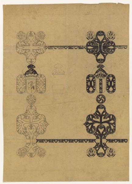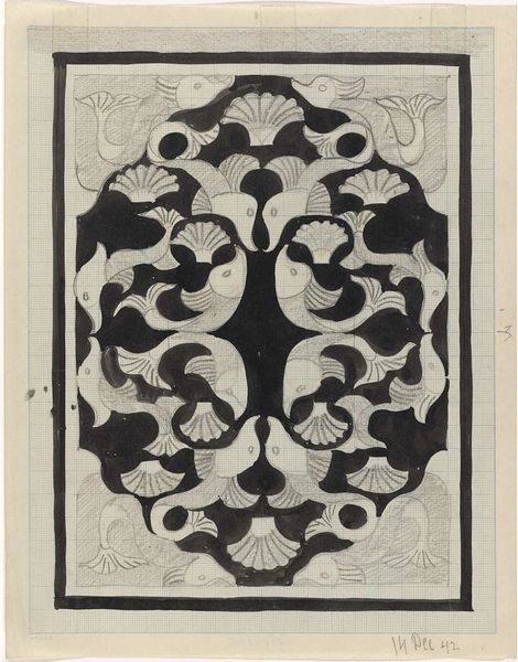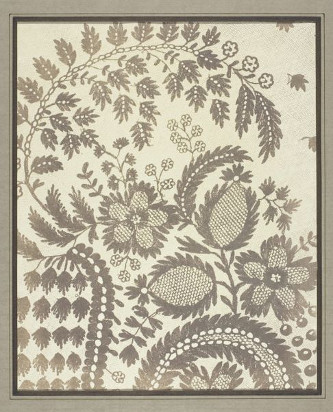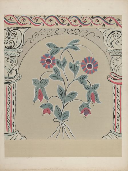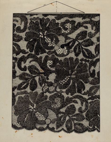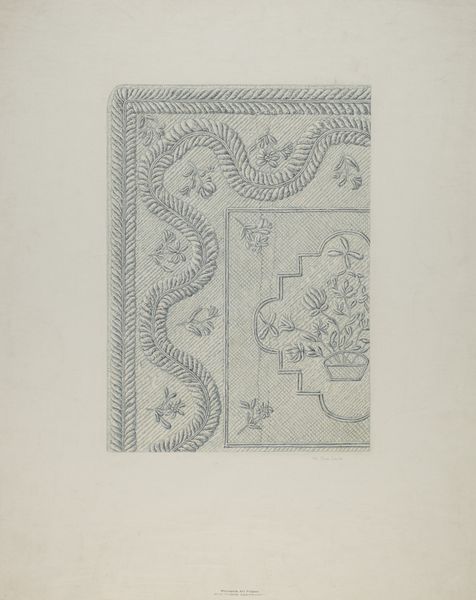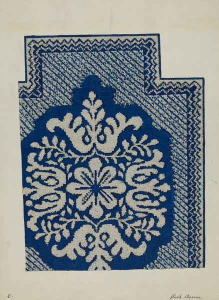 Editor: So, this is a textile design, a "Coverlet" created around 1937 by an artist named Barnes. It appears to be a linocut print and watercolor on paper. I find the texture quite striking. How can we unpack the creation and purpose of such an artwork? Curator: Considering this "Coverlet", let’s examine the process and materials first. The artist chose linocut and watercolor – not traditionally "high art" media, but accessible and reproducible. Think about the social context of the 1930s. What kind of economic factors could have encouraged these choices of media? Editor: I see your point! The Great Depression was ongoing. Could these accessible materials imply an effort to make art, perhaps design for everyday items, more affordable and accessible? Curator: Precisely. And it challenges this artificial hierarchy between fine art and craft. Who was consuming textiles like these, and what did the patterns symbolize to them? The labor involved in both designing and then producing a textile, like a coverlet, is important to consider. It moves art from something purely aesthetic to something functional, and deeply tied to the material conditions of its creation. Editor: So, instead of focusing on the purely aesthetic qualities, we should consider how the economic and social conditions informed the artist's choice of materials and the eventual use of the design? Curator: Absolutely! Consider how this intersects with the availability of materials and the means of production during that era. What impact does mass production have on handmade goods? Editor: This is definitely a fresh perspective. I typically looked at the design elements alone, but this materialist approach connects the piece to its historical moment in a tangible way. Curator: Seeing the artwork in connection to its historical moment and material composition allows a richer understanding and engagement with the creative endeavor. It reveals the relationship of the object to society.