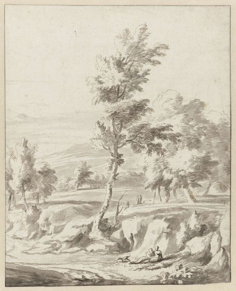 Curator: Hendrik Spilman's "Landscape with Resting Shepherds and Cattle" offers us a pastoral scene rendered in pencil sometime between 1742 and 1784. The location seems fitting, doesn't it? Editor: Yes, a peaceful hush falls over the room looking at this pencil drawing. There's a muted tone to it all, a stillness in the composition. Curator: Notice the shepherds—symbols of guidance and protection, deeply rooted in Western art. And then there are the cattle, representing abundance and prosperity. What do they suggest to you in this particular context? Editor: Well, looking at how precisely the animal’s forms are captured with a humble pencil suggests a connection to the land and its resources, and that in turn speaks to a specific economy in which the material realities of farming and husbandry dictate how value is ascribed. Curator: An astute observation. Consider also how landscapes in Dutch Golden Age paintings often reflect a sense of national identity, a pride in the Dutch countryside. This work seems to consciously evoke that period. What kind of values might this recall? Editor: For me, seeing this as a pencil drawing, the value is clearly in the skilled labor of Spilman's hand – the act of rendering, replicating, recording a landscape and its people. The 'Dutch Golden Age' ideal being circulated isn't as impactful as that of its materiality. Curator: The way he uses line weight to create depth, the subtle gradations of tone that suggest atmosphere. These elements create a believable space but also perhaps communicate something about human influence. Editor: You're right to call it a 'believable space,' one dependent on the accessibility of graphite, the paper available, the labor in deploying these common materials. Curator: A final reflection. The art invites us to find a connection across eras – between that time and our own. Editor: It reminds me that what we often define as monumental is supported by unseen processes of making and labor. Thank you for pointing that out.