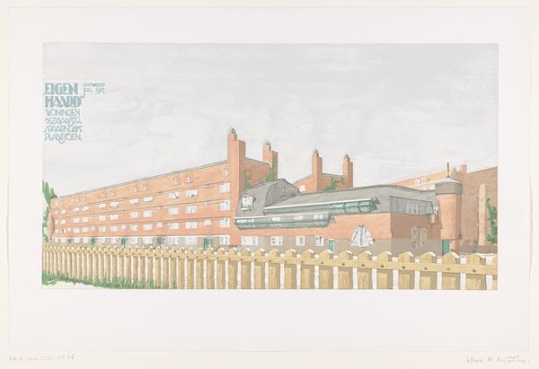 Curator: John Wonnacott's "The Norwich School of Art" presents an imposing architectural portrait. The building dominates the scene. What's your immediate take? Editor: The composition is quite striking, almost oppressive. The muted palette and the sheer scale of the building lend it a somber, weighty presence. Curator: The building, a former textile mill, became an art school, so there's a fascinating tension there, the transition from industry to creativity. Notice the figures on the bridge; they suggest a community, a flow of life engaging with this monumental space. Editor: Indeed, those figures add a crucial human element. The lines of the bridge lead the eye directly to the school, creating a powerful sense of perspective and directing our gaze. The colors create a sense of realism. Curator: The building is really a potent symbol of transformation and artistic ambition. Wonnacott is saying something about the power of art to transform our surroundings. Editor: Yes, and the artist's choice of viewpoint emphasizes the school's solid geometry, it's function as a well-designed building. It's quite compelling. Curator: A fascinating intersection of place, purpose, and people. Editor: A stimulating study in form and context.