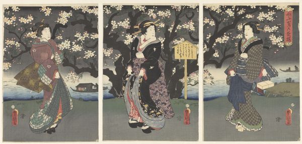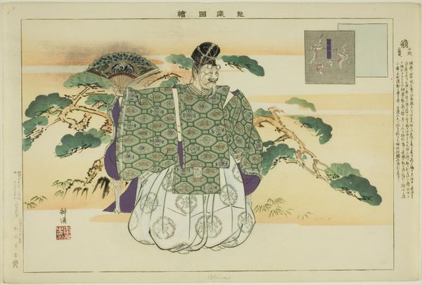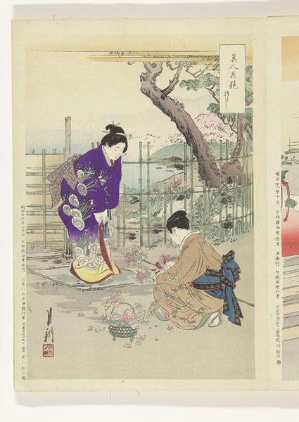 Ogata Gekko created this color woodblock print, Iristuin, in Japan during the Meiji period. The Meiji era marked a shift in Japanese art. Artists like Gekko navigated between traditional techniques and emerging Western influences. Here, a woman in a light kimono walks across a narrow bridge which cuts through a field of irises. Her calm expression and elegant posture reflect an idealized version of femininity, deeply embedded in the cultural norms of the time. The woman's connection to nature suggests a harmonious relationship with the environment, yet one cannot ignore the socio-political context that shaped such imagery. The print reflects both a celebration of Japanese identity and a subtle negotiation with Western expectations of Japanese culture. While this work seems to maintain traditional representations, it also invites viewers to consider the complex interplay between identity, nature, and cultural expectations. The artist invites us to reflect on how these narratives shape both personal experiences and broader societal issues.