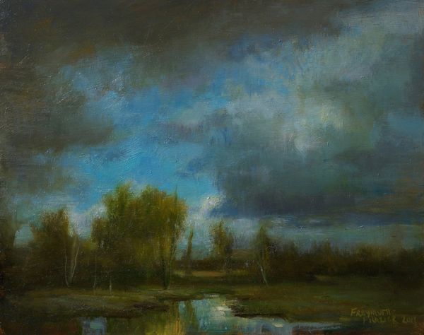 Rose Freymuth-Frazier made this painting, As the Moon Rises, using oils to conjure a scene of dusk or dawn, where the boundary between day and night blurs. The brushstrokes are laid down with a kind of tender urgency. Look how the paint is applied, not to mimic the thing itself, but to explore the very process of seeing. The surface has a kind of slippery feel, like the paint is still wet. I love the tension in the composition, like the landscape is holding its breath. It’s as if Freymuth-Frazier is asking: how can we feel the fleeting nature of time passing? Check out the way the light hits the horizon line. It is like a cosmic glow. This isn’t just about depicting a landscape, it’s about experiencing a state of mind. Turner comes to mind, someone else who sought to capture light and atmosphere, but Freymuth-Frazier has a rawer, more immediate feel. It reminds us that painting is not just about seeing, but about feeling and being in the world.