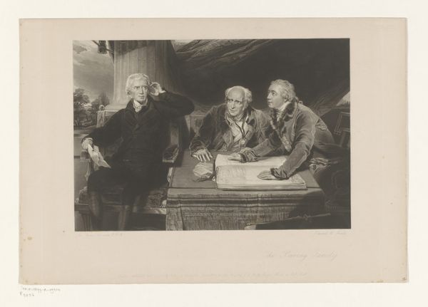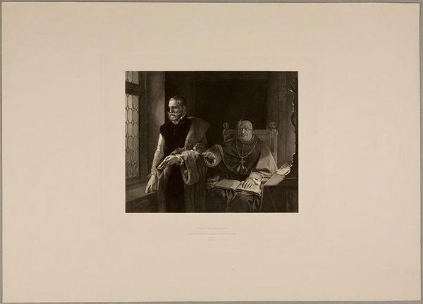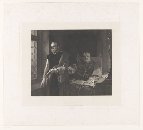 Frederik Hendrik Weissenbruch made this print, "Last Moments of Lamoraal van Egmond in his Cell," in the Netherlands, though the specific date is unknown. It depicts the count awaiting his execution with a clergyman. The image participates in a long tradition of history painting, a genre that gained prominence with the rise of national museums and academies in the 19th century. It elevates a specific historical episode to the level of high drama, inviting viewers to reflect on themes of sacrifice, injustice, and the struggle for freedom. Weissenbruch's work is thus very much in line with the cultural and political climate of his time. The print's success depends on an appeal to shared cultural knowledge. Its original audience would have known the history of The Eighty Years' War, between the Netherlands and Spain, and understood Egmond’s importance within it. To fully appreciate this artwork today, we can turn to historical archives, political pamphlets, and other visual representations of this important historical moment. These can help us reconstruct the complex web of social, political, and cultural forces that shaped both Egmond's fate and Weissenbruch's artistic vision.