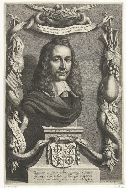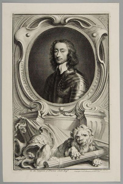 Curator: Take a moment to consider this print, "John Hampden" by Jacobus Houbraken, currently residing here at the Harvard Art Museums. Editor: There’s a quiet dignity about him, but also a bit of steel. I love how the armor hints at a life beyond just sitting for portraits. Curator: Absolutely. Houbraken really plays with the textures of the printmaking process here, using etching and engraving to differentiate between the smoothness of the face and the sheen of the armor. The print is interesting, a reminder of how images circulated and were consumed as political currency. Editor: It's like he's caught between worlds—the refined artistry of the oval frame and the bloody battle scene at the bottom. You see the Magna Carta there too. It grounds Hampden’s defiance in something bigger than himself, doesn’t it? A fight for fundamental rights. Curator: Precisely. And by circulating this image, Houbraken participates in a longer conversation about the relationship between governance, representation, and the rights of individuals. The print acts as both art object and artifact, reflecting its historical moment. Editor: It's a powerful thing, to see someone who stood for something, immortalized like this, wrestling with the very ideas that defined their time. Makes me think about the battles we’re still fighting today.