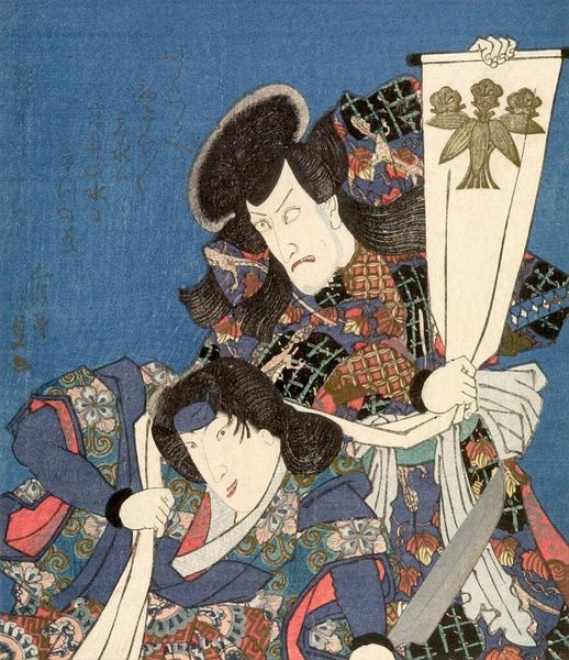 Utagawa Kunisada created this woodblock print depicting the actor Ichikawa Danjuro VII as Iga-no Jutaro. Kunisada lived through a period of social and political upheaval in Japan, marked by the decline of the shogunate and the rise of a merchant class that shaped the cultural landscape and the Kabuki theatre. This print captures a moment of intense emotion, typical of Kabuki theater, with the actor’s exaggerated expression and dramatic pose. The whited face is striking, and it emphasizes the constructed nature of identity within the theatrical space. Prints like this one were not just commercial products. They also played a role in shaping the celebrity of Kabuki actors and in reflecting the social values and norms of the time. Consider how the print, produced for mass consumption, catered to the desires and fantasies of its audience, reflecting the complex interplay between art, commerce, and identity in 19th-century Japan.