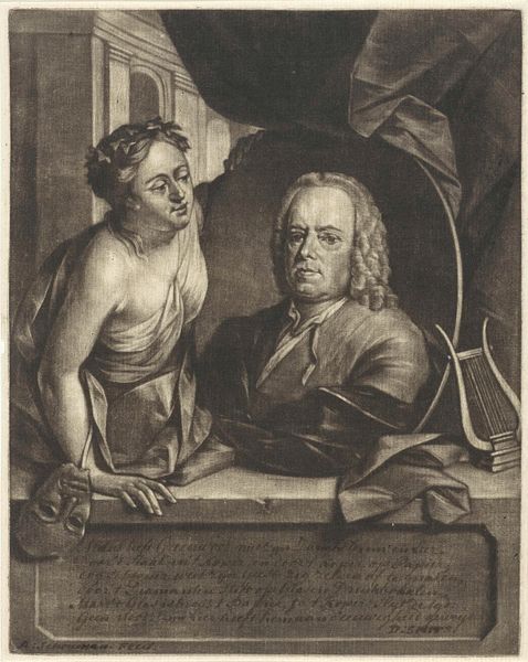 Curator: Before us is "Bustes van Gerard de Lairesse en Albert Flamen", an engraving created in 1721 by Jacob Houbraken, held here at the Rijksmuseum. Editor: It's immediately striking. The textures created simply through line work, the almost overwhelming density of detail. Curator: Indeed. Houbraken, known primarily as a biographer of Dutch Golden Age painters, was also a skilled engraver. This piece showcases his technical ability and the value placed on artistry during this period. We see two busts, set upon elaborate plinths adorned with decorative elements. The medium of engraving itself speaks to a growing print culture, disseminating images widely and contributing to the construction of artistic reputations. Editor: I am especially intrigued by the artist's attention to detail in capturing the subjects' garments, the heavy drapery cascading behind them, the curls of the wig on the right bust, and even the pages from a sketchbook below, each crafted from simple lines. Curator: The presence of the sketchbook, palette, and other tools hints at the creative professions of Lairesse and Flamen themselves, embedding them in a narrative of production. Houbraken wasn't simply replicating likenesses, he was contextualizing them as producers within a particular economic and social system. Editor: Yes, I see how those visual clues deepen the sense of context. The engraving technique creates a striking visual presence that adds complexity beyond pure portraiture, a certain grandeur is established in the process of memorializing artistic legacies. Curator: Think about who was buying these prints and why, they offered accessibility. Owning an engraving of Lairesse or Flamen was a statement, an act of participation in a specific artistic community and discourse. It offered a sense of closeness to famous figures that may have previously been unreachable. Editor: So, beyond pure aesthetic admiration, owning a print like this placed someone within a specific social network. Curator: Exactly. By investing in art and the images that reproduce art, they were simultaneously consuming the products of cultural labor and helping support the system. Editor: Looking at it from my perspective, it's compelling how Houbraken masterfully manipulates linear patterns to portray form, texture, and even social identity within the conventions of baroque aesthetic ideals. The image creates a micro-universe using solely line-work. Curator: A convergence of form and function— the materiality of the print serves a purpose beyond mere visual representation. Editor: Indeed. The more we analyze, the richer the layers of history and purpose seem to appear in the engraving before us.