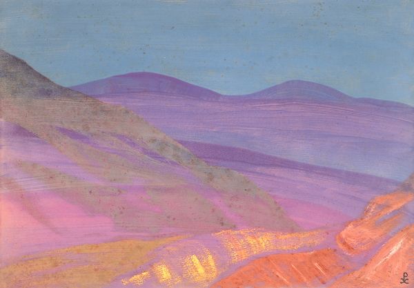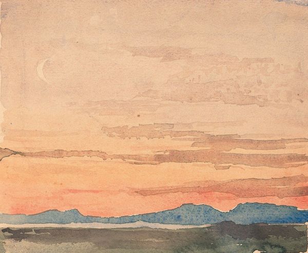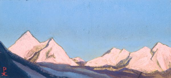 Editor: So, this watercolor, "Mongolian Yurtas" by Nicholas Roerich, painted in 1936, presents these simple, almost elemental forms under a vast sky. The yurts themselves seem very vulnerable in the landscape. How do you interpret this work? Curator: These "vulnerable" yurtas, as you describe them, speak volumes. Roerich, though a Russian artist, was deeply invested in Eastern cultures and philosophies. He wasn’t merely painting a landscape; he was engaging with symbols of community, spirituality, and cultural memory. Editor: Cultural memory? Curator: Yes, think about the yurt itself. It's not just a dwelling; it’s a symbol of nomadic life, of adaptation and resilience in the face of a challenging environment. Its circular form could even be interpreted as a mandala, a representation of the universe and inner peace. Do you see how the subdued palette reinforces that sense of quiet contemplation? Editor: I do. It almost feels timeless, like this scene could exist in any era. Curator: Exactly! Roerich often used recurring visual motifs – mountains, clouds, simple dwellings – to convey a sense of continuity across cultures and through time. The mountains, for example, resonate deeply with ideas of spiritual aspiration and permanence. Roerich painted the Himalayas for years. What sort of feeling is he invoking by placing these architectural structures at the base of such large landforms? Editor: So, it’s not just about the visual, it's about the history and cultural weight embedded within the imagery. Curator: Precisely. It's about Roerich's attempt to portray an archetype of human-environment harmony. This harmony is built by cultures all across the earth over countless generations. Editor: I see it now. It's a much richer scene than I initially realized. Thanks!