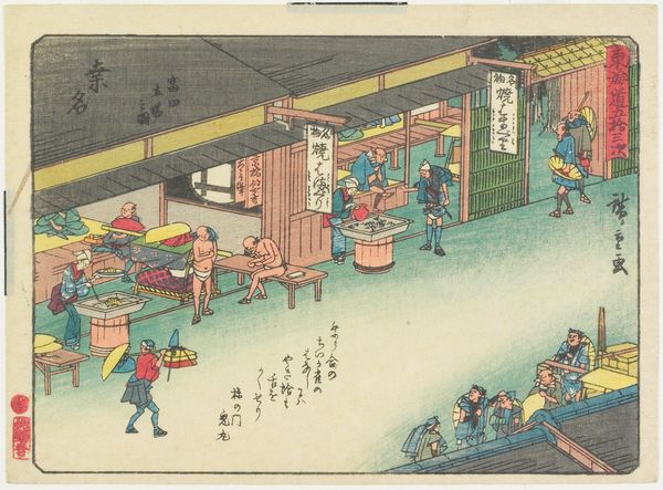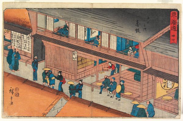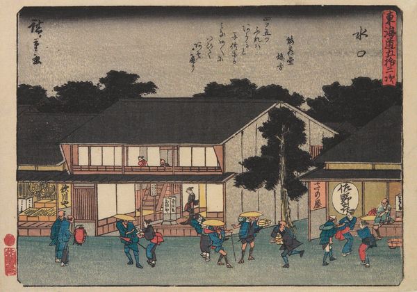 Curator: Look at the weariness etched into those faces, wouldn't you say? Like poems written in the lines beside their eyes... Editor: Indeed. Here we have Utagawa Hiroshige's woodblock print, "Entrance Hall of The Inn in Seki," created around 1841-1842. This piece offers us a fascinating glimpse into life along the Tokaido Road, the major route connecting Edo—modern-day Tokyo—with Kyoto. Curator: It is just such a tender, even sensual, little scene! Like watching fireflies from an open window... The colors have a certain dreaminess to them, despite their obvious grounded reality. You just wanna step into it, right? Feel that gentle summer heat shimmering in the air. Editor: Absolutely. And what is particularly captivating is Hiroshige’s masterful use of perspective. We see the inn, not as a static structure, but as a hub of bustling activity. It really showcases ukiyo-e prints' focus on everyday life—this 'floating world'. But this focus comes from the art’s function to support the shogunate through images normalizing an intricate social hierarchy. Curator: Mmh, you intellectualize my dreams away... The charm! Think of the narrative possibilities. Who are these figures? What brought them together at this specific moment? And who is standing with their bare feet in the water? What happened? My brain can't decide! The possibilities seem endless. Editor: Indeed. The woodblock medium is crucial here too; it allowed these images to be reproduced widely and circulated, creating a visual culture of the Tokaido road itself as well as a representation of societal strata. It served not just as an observation of the population and society in that period, but also its standardization by the visual depiction through art that would gain wide currency as cultural touchstone. Curator: A window into history through a dream. That’s lovely. This isn't a political portrait, you can make anything you want of it... the perfect space to wonder. Editor: Exactly, which is probably why it's stayed with us as a society to wonder at, even beyond that first glance at its material history and social context.
