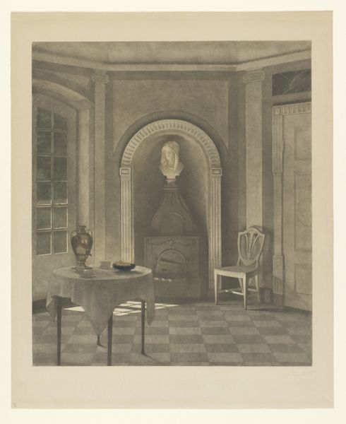 Curator: Peter Ilsted's "Sunlight on a Door," created around 1910, greets us with a masterfully rendered interior scene. He employed the meticulous techniques of etching and mezzotint to create this intimate moment. What’s your immediate take? Editor: It feels quiet, almost monastic. The light is so insistent, slicing through the space. Makes you think about what’s outside versus the contained, almost trapped feeling within. Curator: Precisely! Ilsted's world here focuses on domesticity, an echo of Intimism where the home and those inside take center stage. Look how he captures the gradations of light; it's practically tangible, right? Editor: Absolutely, you can tell the value he puts on production with his play of light! The textures achieved with the etching and mezzotint are incredible—feel the shadows playing across the floorboards, how light illuminates that plain wooden door! Curator: His commitment to material translates beautifully here. Did you know he often featured the same room, with subtle changes in light or positioning of figures? Almost a personal exploration. It almost feels as if it's in the realm of Northern Renaissance; think about that with how much this captures this domestic life, much like what a woman's job would be like during the period. Editor: Right, it feels like that labor focus really comes across well! This door itself is kind of this liminal space to transition in. Ilsted makes something from basically the simplest and the cheapest resources during this time— it's such an understated declaration! Curator: The choice of printmaking is important, too. It allowed wider dissemination of this "ideal" domestic life to wider audience, reinforcing these notions within his contemporary Danish society. Almost as a means for many others to enjoy art! Editor: But you know, for all that it evokes this cozy picture of Danish society, there's still an element that doesn't translate well when looking back, and feels so separate to us now. Something that’s very period specific, it really brings that labor into it Curator: Maybe that tension is part of what makes it so compelling, that conversation between past and present, inside and outside. Thanks for helping bring more depth! Editor: For sure. Considering Ilsted's creative output, its medium and audience provide a whole world to talk about.