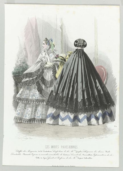 Curator: Oh, the chic of it all! These are two supremely dressed ladies, no doubt freshly scented, pausing for a promenade near what I presume is a Parisian park. It is an etching, drawing, print, really a delightful mixed-media piece titled *Les Modes Parisiennes, 1878, No. 1749*, which if I am reading the script correctly, is for Parfumerie Oriza of L. Legrand. Editor: There’s something undeniably melancholic about it though. The soft, diffused light gives it a dreamy, almost ethereal quality, as though this scene exists more as a wistful memory. Those vertical stripes almost give me vertigo as they narrow towards the back of the dress. Curator: It's definitely serving up romantic vibes. The women, observed from behind, as though we've accidentally stumbled upon a very private, very stylish moment. Each is an allegorical figure of consumerism; but in their shared pose, with hands touching, this speaks of a time just prior to all the mechanizations of modernity. Editor: Yes, allegorical figures indeed. The way they're positioned near the water; a lake? Bodies of water often represent the subconscious, don't they? Perhaps their stylish exteriors barely conceal what lies beneath. And those hats, rather demure. What kind of message did headwear signify for 19th-century women? Curator: I suppose what they literally covered up, what they let peek through the veil, so to speak, signified social roles of domestic tranquility while hinting at veiled desire and ambition. One can imagine these very ladies debating corsets versus, what... looser garments! While the men talk politics, the women forge fashion! Editor: Their dresses carry such symbolic weight; elaborate signifiers that broadcast to the world who they were, or perhaps, who they aspired to be. Like complex uniforms that hid and expressed the selves within. Curator: Yes! Perhaps what really seduces me is the implicit narrative. They are characters, you see, in the grand soap opera of daily life. The composition allows us to fantasize, as though glimpsing our own lives within theirs. It asks what roles do we play and what are we marketing. Editor: Perhaps that is why these types of portraits maintain such enduring allure for us. Echoes from another time... showing the past in very revealing and concealing fashions. Curator: It all does make you think. Thank you!