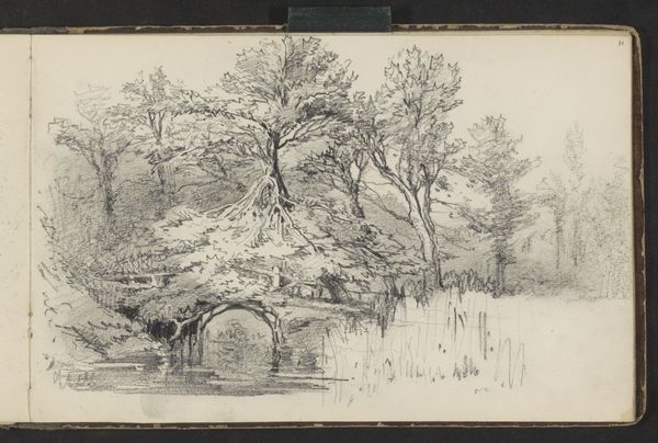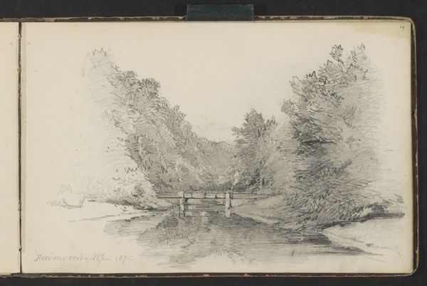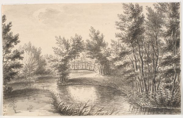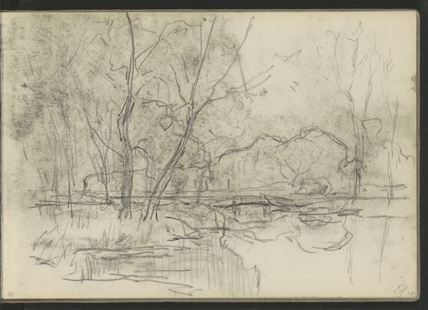 Editor: We're looking at "Bruggetje over een sloot langs een bosrand," or "Bridge over a ditch along a forest edge" by Willem Witsen, created sometime between 1870 and 1923. It's currently held at the Rijksmuseum. It feels like a very personal sketch, almost like a fleeting moment captured in a journal. What stands out to you in this piece? Curator: Well, the use of toned paper and the light pencil work immediately place it within a specific artistic and social context. During this period, sketching *en plein air*, was becoming increasingly popular amongst artists wanting to capture the immediacy of nature, before industrial expansion changed the landscape. Editor: So, this wasn’t necessarily intended for public display? Curator: Not initially, no. It's more akin to a visual diary entry. These sketches offer insight into the artist's process and personal connection with the environment. Witsen was deeply concerned about the encroaching urbanisation of the Dutch landscape. Do you notice how the composition almost seems to be divided? The orderly fence and house on the left versus the dense, natural forest on the right? Editor: I do now that you mention it! It’s like a visual representation of that tension you’re describing. So, it's less about the literal depiction of a bridge, and more about... Curator: Exactly. It's about the dialogue between nature and culture, a recurring theme in art responding to rapid industrial and social change. Consider who had the time and resources to contemplate and capture such scenes. Art like this can tells us about class, privilege, and emerging environmental concerns. Editor: That makes me see it in a whole new light! I initially just saw a simple sketch, but now I understand how much cultural context is embedded within it. Curator: Precisely! That is what makes art so rewarding!