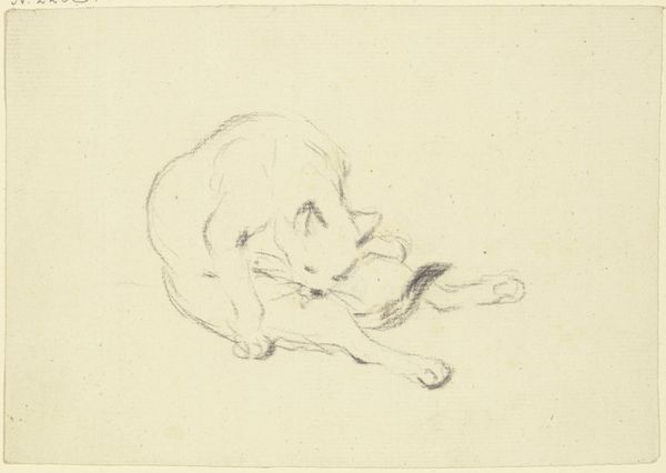 Curator: I find this pencil and chalk drawing, "Grooming Cat," currently held at the Städel Museum, immediately endearing. It seems to capture a quiet, intimate moment. What are your first impressions? Editor: Honestly? My first thought is just how gloriously awkward cats are. All elbows and angles and intense self-care. The scratchy lines add to the humor—it feels like the artist caught the cat mid-gymnastics routine. Curator: Indeed. Hirt seems particularly interested in conveying texture here—the contrast between the smoother lines defining the cat’s body and the more frenetic scribbles used to suggest its fur invite the eye to consider how this natural subject reflects deeper meanings. Consider how often cats have been symbolically linked to vanity. Editor: Oh, definitely. But it also makes me think about the simple pleasures. A good stretch, a thorough bath... Sometimes, you know, I look at my cat and I'm like, "You've got it figured out." There's a mindfulness to it that I think the artist really captured. Curator: That speaks to a perennial question asked by humanity: How do we truly see, interpret, and remember an image? Throughout history, visual symbols of cats recur in myriad ways, both revered and reviled. There is even psychological theory about this dichotomy, as our feline friends present both tameness and wildness at once. Editor: See, I love that. This little sketch isn't just a cute cat; it's tapping into something much older and universal. The casualness of the drawing makes it all the more potent. Curator: I concur entirely. And considering the absence of background, it allows us to focus squarely on the ritual taking place. Editor: I think I might just try to channel my inner cat a bit more today, find some of that focus and self-care. Curator: Perhaps a beneficial exercise for us all! Thank you for this delightful reading.