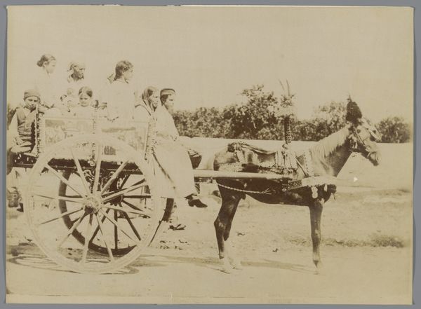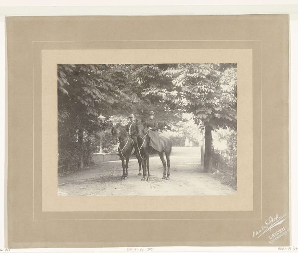 Curator: This gelatin-silver print, dating back to around 1897, is attributed to Nicolaas Schuitvlot. The work, titled "Leden van het Amsterdamsch Studenten Corps in een koets," which translates to "Members of the Amsterdam Student Corps in a carriage," resides here at the Rijksmuseum. What are your first thoughts on this romantic era photograph? Editor: My initial impression is of a carefully staged tableau. The arrangement of figures within the carriage and the strong horizontality—countered only by the verticals of the trees in the background—it’s all so deliberately composed. Curator: The context here is critical. Schuitvlot was capturing a very specific segment of Dutch society, the Amsterdam Student Corps. These weren’t just any students, but the elite, largely upper-class members of a prestigious organization. The image, in its original form, would likely have circulated amongst them, reinforcing their social standing and sense of community. It’s a manufactured image of belonging. Editor: Yes, the class dynamics are definitely a silent undercurrent here. But, formally, look at the use of light. Schuitvlot has chosen a time of day that creates strong shadows beneath the carriage, giving it weight and grounding, literally and symbolically. The tonal range he coaxes from this monochrome image is striking; notice the graduation from bright road to darker foliage. Curator: Considering this as genre painting expands my interest. We’re not just seeing a posed portrait; we're getting a glimpse into the rituals and traditions of this social group. I wonder about the role of the photographer, Schuitvlot. Was he commissioned by the Corps? Was this a purely commercial endeavor? These factors influence not just what’s depicted, but how. The production becomes very telling. Editor: Absolutely, and that interplay affects how we, as viewers, decode it today. We can note the careful arrangement, the light, but also the less obvious semiotics of their uniforms, expressions. Everything serves this central idea of belonging. Even the soft focus enhances that idealized impression. Curator: Ultimately, the print represents a moment, constructed and carefully curated, within a closed social circuit. It provides a valuable material record for examining structures and networks within Dutch society at the time. Editor: Indeed, and those observations really amplify my formalist reading, demonstrating how composition and tonality create far more meaning than initially meets the eye.