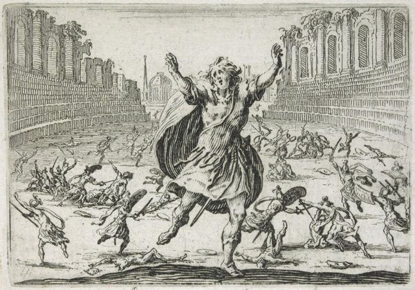 Editor: Here we have Jacques Callot's "Soldier in a Circus Ring." The etching’s tiny size belies the chaos it depicts. What socio-political context informed this piece? Curator: Callot lived through the Thirty Years' War. Consider the perspective – a soldier, isolated in this arena of violence, with a crowd of spectators. Doesn't this reflect how war can become a spectacle, a form of entertainment detached from its brutal realities? Editor: Absolutely. The soldier's theatrical pose makes me wonder, is he a victim or a performer? Curator: Perhaps both. Callot's etching confronts us with uncomfortable questions about the glorification of violence and the public's complicity in it. Editor: I never thought about it that way; the audience is almost as terrifying as the battle. Curator: Precisely. It’s a potent commentary on the normalization of conflict and the desensitization it breeds. Editor: Understanding the historical context really transforms my understanding of this etching. Curator: Indeed, seeing it through the lens of its time deepens its impact.