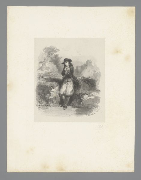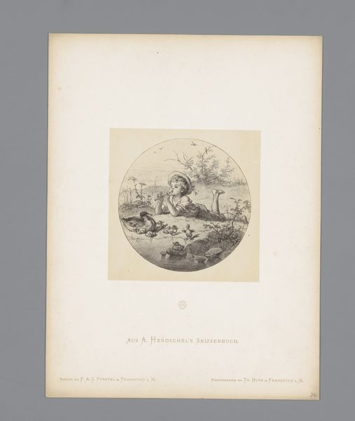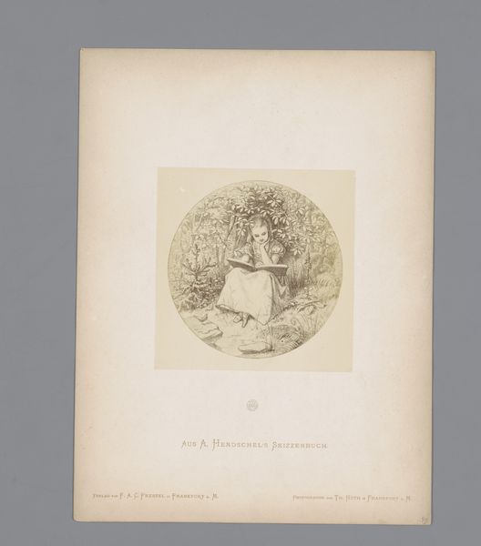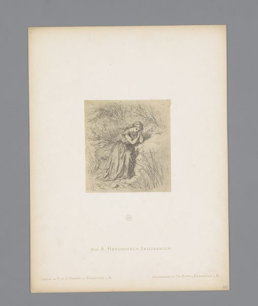 Editor: Here we have a photo reproduction of a sketch made before 1870 by Albert Hendschel, titled 'Fotoreproductie van een schets van een meisje dat bloemen plukt.' It appears to be a pencil drawing on paper with some kind of pale wash to it, maybe aged? How do you interpret this work? Curator: Given its historical context, consider the paper itself. Likely handmade, and perhaps reflecting a localized industry of paper production? What about the photographic reproduction of a drawing—how does that democratize art or change its mode of consumption in this period? Editor: That's interesting, the means of distribution I hadn’t considered. It speaks to a shift in who could access art… What else does that entail, in terms of consumption and readership of such images? Curator: This opens many potential interpretations. Hendschel's original sketch likely functioned as an intimate record, perhaps part of a personal journal as it is sketched ‘Aus A. Hendschel’s Skizzenbuch,’ then turned into a reproducible item for mass consumption. Does the shift from unique artwork to readily available reproduction affect our engagement with it? Are we meant to see a glimpse into Hendschel’s own view, or something else? Editor: I never thought about mass consumption of art in this time period! Thanks for opening my eyes to how artistic production changes how we interact with the image itself! Curator: It is the blending of art, reproduction technology, and economics of everyday life that really brings forth the artwork’s intrinsic, cultural meaning.