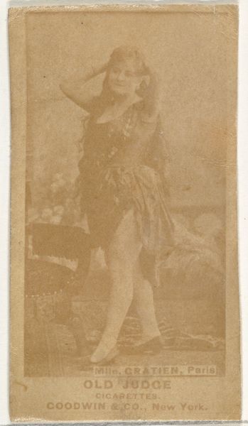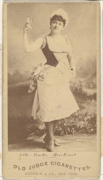 Curator: Here we have "Pauline Markham," a photograph produced sometime between 1885 and 1891 by Allen & Ginter as part of their Actors and Actresses series to promote Virginia Brights Cigarettes. Editor: It's funny to see her image used to sell something as decidedly unglamorous as cigarettes! But the hazy sepia tones give the image a dreamy, ethereal quality. Almost otherworldly, you know? Curator: The composition reinforces that effect, certainly. The pose and gaze draw attention to her face, but the slight blur gives the impression of a memory, not a concrete presence. It also exemplifies the popular portraiture of the period. Editor: Portraiture in service of commerce. Do you think she knew that her image would outlive her performances by so long, attached as it is to the cult of smoking? It's a weird sort of immortality. Curator: It's an interesting point. As a product of mass production, it speaks volumes about the period’s values, the conflation of beauty, fame, and commodity. The visual rhetoric implies she embodies a kind of aspiration, but the cigarettes suggest indulgence. Editor: A delicious and dangerous dream—nicely packaged for easy consumption! Still, there’s something poignant about it. This young woman's moment captured for what, a brief, fleeting dance of celebrity? Then cemented in a cigarette packet forever! Curator: These ephemera give an illuminating glimpse into the culture that both celebrated and, perhaps inadvertently, trivialized artistic expression through its association with consumption. Editor: So true, I like how it gives us pause. To think about who Markham was beyond the photo, it invites me to linger with the image and consider her reality and mine.