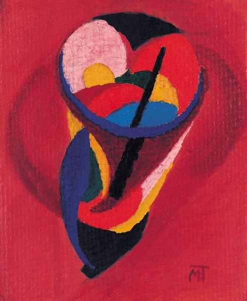 Editor: This is "Composition" by Janos Mattis-Teutsch, created in 1922 using oil paint on panel. The bright colors feel surprisingly joyful, almost defiant, against the somewhat somber background. How do you interpret this work, considering its historical context? Curator: Given the social and political turbulence of the early 1920s in Europe, particularly in the aftermath of World War I and the rise of various modernist movements, this painting's vibrant colors and geometric forms are intriguing. This Expressionist piece could be a rejection of established artistic norms and also perhaps a visual response to the instability and rapid changes occurring in society. What about the composition strikes you? Editor: I see these sharply defined shapes, almost fighting for space within that soft, rounded frame. It's like order imposed on chaos. Curator: Precisely. Think about the institutions that were gaining or losing power then, the artistic manifestos being published, the new ways of seeing and being. The centralized composition in this painting, does it remind you of anything? Does the color have any specific historical meaning? Editor: I see your point! Maybe the centralized composition symbolizes the struggle for stability or perhaps the color are an intentional attempt to counter prevailing bleakness. But how did the art world react to this kind of work? Curator: Works like this often faced harsh criticism from more conservative factions, who saw them as degenerate or incomprehensible. However, they were embraced by avant-garde circles eager to explore new visual languages that reflected their experiences of the modern world. Mattis-Teutsch's work offers a glimpse into that complex dialogue. Editor: I never considered how art becomes a visual commentary on social and political change, or even shapes social perceptions. That's really fascinating. Thanks! Curator: Indeed. It’s through considering the public role of art that we understand its true power. Thank you.