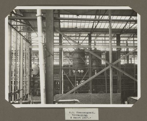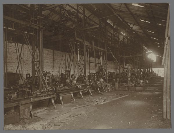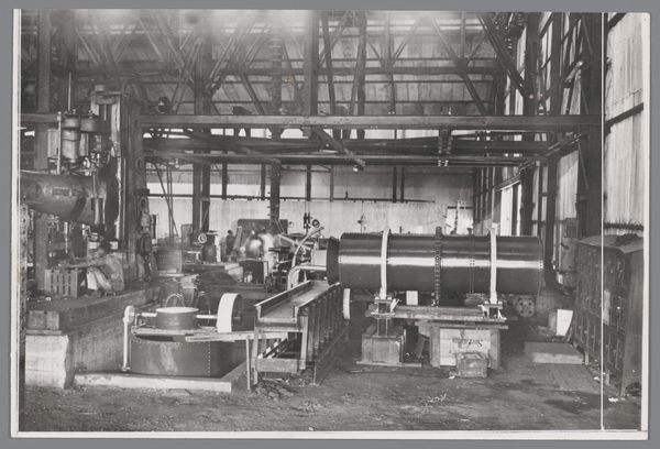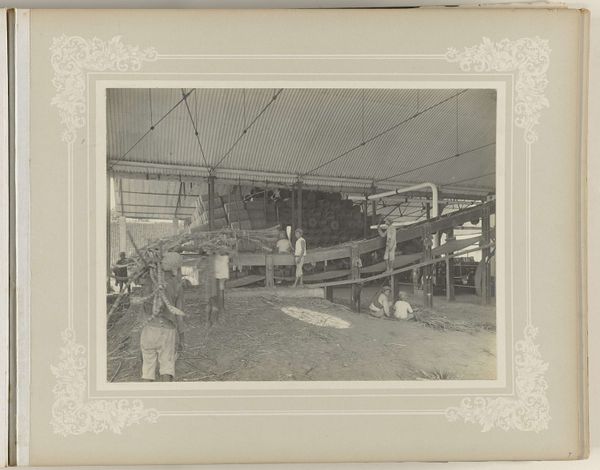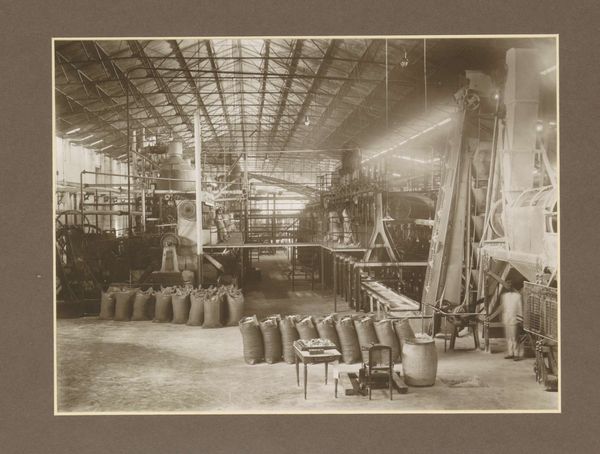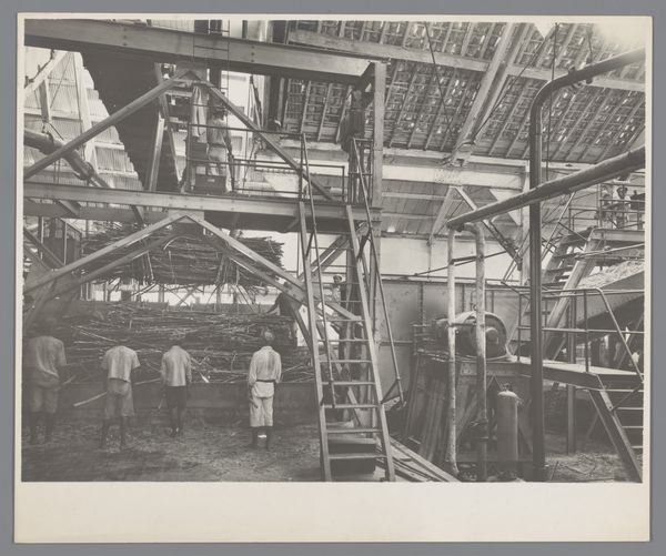 Curator: Otto Hisgen captured this compelling industrial scene sometime between 1917 and 1938; he called it "Rietlosinrichting in bedrijf," which translates roughly to "Reed Disposal Facility in Operation." The realism is striking. Editor: Immediately, the composition hits me with an oppressive sense of industry devouring nature. That huge stack of reeds looks almost like a offering. Curator: I find the photograph compelling when considered through the lens of labor history. Images like this document the material processes that contribute to larger global capitalist systems. Where did these reeds end up? Who benefitted? Who suffered? Editor: Right, and I feel like the machinery dwarfs the raw material. You could almost see the reeds as standing in for bodies or spirits in that dehumanizing arrangement. Curator: Precisely. The industrial machinery depicted stands as a visual testament to a society structured around resource extraction and production, but this also needs to acknowledge potential human suffering connected with labour practices, socioeconomic divides, and ecological degradation that underpin progress. Editor: You know, beyond the weight of the theme, I can’t help but see a twisted sort of beauty in it. The sharp geometric lines of the architecture against the chaotic piles of organic material? The gray scale lends a certain dreamlike timeless quality... Almost like looking into the memory of a machine. Curator: The use of metal in its structure provides insight into this society's reliance on mass production techniques to sustain these operations on an industrial scale. Metal speaks to durability and permanence – concepts directly at odds with the perishability of the reeds themselves. Editor: Definitely, but I keep going back to how strangely pretty it all is, regardless of the larger implications. It speaks to something haunting, yet almost...magnetic? Maybe that tension is its own strange success. Curator: Yes, that aesthetic allure pulls us into uncomfortable truths. This photograph speaks volumes about industrial exploitation and our complicity in it. Editor: I like that --a disturbing, beautiful truth about reeds turned into things and people doing the turning.