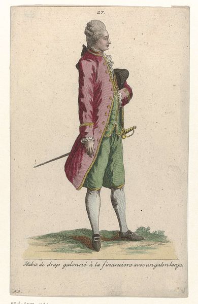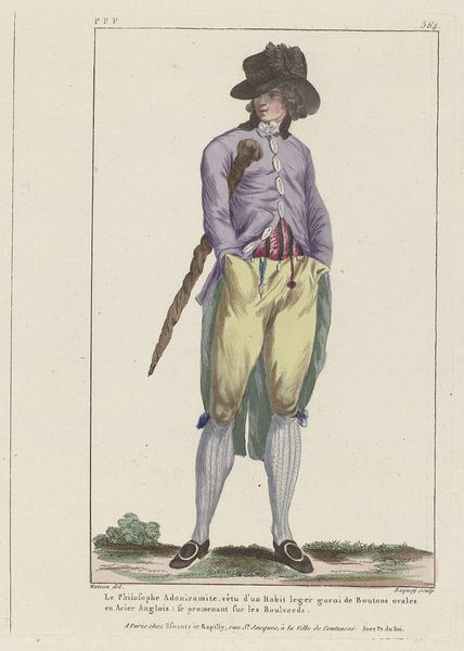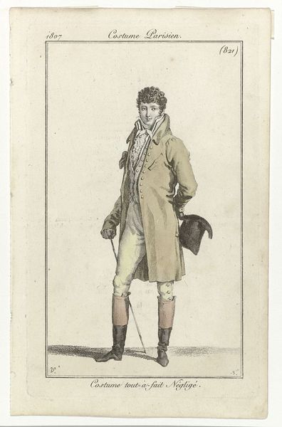 This is an engraving from Journal des Dames et des modes, made by Pierre Charles Baquoy, in the late 18th or early 19th century. It is an example of what we might call ‘fashion plates’ – images circulated to communicate the latest trends. Look closely, and you'll see the material reality it represents: expensive textiles. The man’s ensemble, including his coat, breeches, boots, and even the umbrella, speaks to the labor involved in producing these goods. Consider the skilled tailors, weavers, and leatherworkers who contributed to such garments. Each stitch, each dye, represents human effort. Fashion plates were a critical engine of burgeoning capitalism, fueling consumption and desire. They raise questions about the relationship between art, commerce, and class. This engraving isn’t just a pretty picture; it’s a document of a world being made. By understanding the materials, processes, and social context of its creation, we come to a richer understanding of its meaning, challenging the traditional separation of high art and craft.