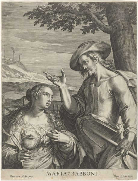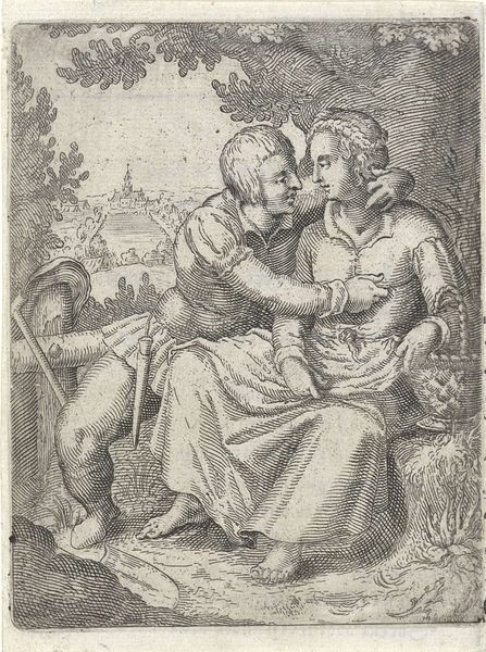 Curator: Oh, this print! It's *Man Embracing a Woman* by Daniel Hopfer, from around the late 15th or early 16th century. It's currently held at the Harvard Art Museums. Editor: The etching gives an immediate impression of longing and constraint. The figures seem stiff even in their embrace, somehow caught in a story they can’t quite control. Curator: Hopfer was quite the innovator. He was a master armourer who transferred his metalworking skills to printmaking, pioneering etching techniques. Editor: Yes, and look at the way that armour is rendered, each plate meticulously detailed. The work is so materially evocative. It’s a testament to the labour and skill embedded in both warfare and artistic production. Curator: I find their expressions so intriguing. The woman seems almost resigned, while the man… well, he’s clearly smitten, isn’t he? Editor: Maybe, but I see a commentary on societal expectations, the roles prescribed to men and women, and the labour inherent in maintaining those structures. Curator: I think both are true. It's a glimpse into a complex relationship, beautifully rendered through this innovative technique. Editor: Absolutely. It makes me reflect on how material practices can shape and reflect our most intimate human experiences.