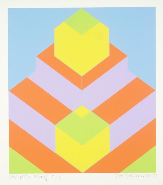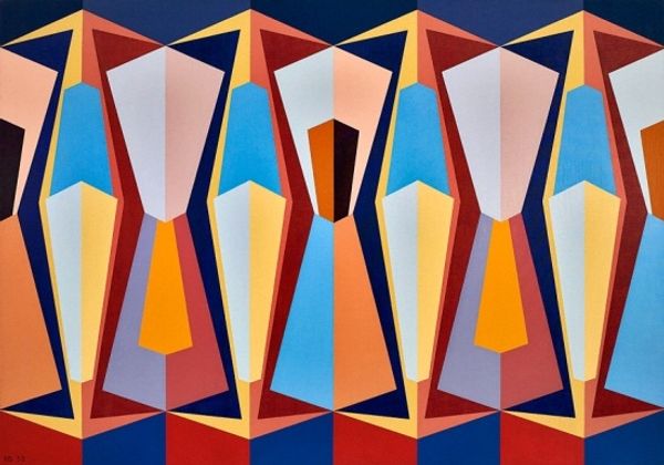 Curator: Standing before us is Clarence Holbrook Carter's "Untitled - Faces in a Grid (Red and Blue)" from 1973. It’s executed in acrylic paint, if I’m not mistaken. Editor: Oh, wow! Immediately, I’m struck by how dizzyingly vibrant it is. It has a rhythmic pulsation almost. All those overlapping shapes playing tricks on my eyes. Curator: Indeed. It’s got that distinctive op-art, hard-edge painting vibe, with its geometric abstraction. It feels like a face reflected through a kaleidoscope, repeating, distorting. A real hall of mirrors. Editor: The shapes are quite interesting. Almost like stylized teardrops pointing downwards, nestled in the embrace of crisscrossing diamonds, a symbol of clarity and truth in some cultures. But arranged in this relentless grid... does that somehow dilute their power? Or amplify it, by their sheer presence in multitude? Curator: Good question. I find that in some abstract works the meaning shifts like sand in the wind, it changes. In this instance I feel they’re almost glyphs from some unknown culture – each 'face' a character in a system we can’t quite decipher, hinting at order hidden within abstraction. Editor: So, this repetitive nature makes me think about conformity, about being one face in a crowd, while still maybe trying to show some individual character, with its placement within the bigger picture... Does it reflect anxieties of that time, or the cold detachment that would develop from abstract expressionism? Curator: The era definitely shaped its language, but artists play tricks on me sometimes. With abstraction, so often people try to put narrative into an otherwise silent structure. Maybe that’s a response, a desire to pull away, like, I will communicate, but not necessarily with words or representational shapes…but with angles. Editor: It’s certainly thought-provoking. In any case it’s still something one could enjoy in itself, even with it's cold palette. It draws you in. I didn't notice this earlier but there is also a warm underpainting below this icy blue. Curator: That’s Clarence Holbrook Carter’s little secret. What started as a surface remains with his message behind these planes. That he chose acrylic helps enhance these translucent, hard-edged patterns too. Editor: It’s a piece that continues to offer new perspectives with each viewing, then. A structured dance between precision and ambiguous identity. Curator: I completely agree; a fitting end to our journey with these fascinating geometric faces. Let's move on to the next work.