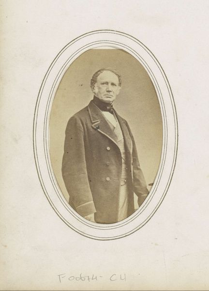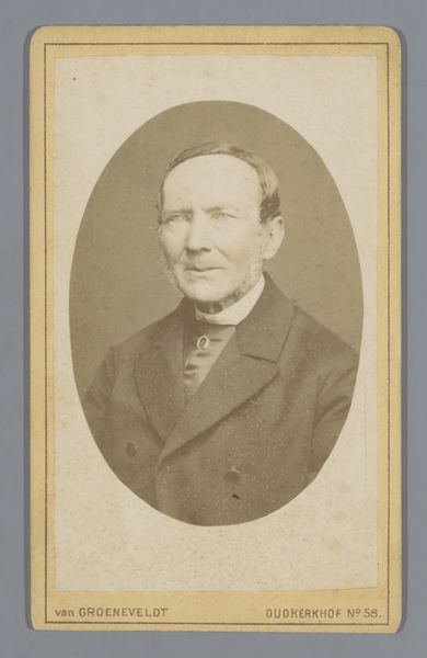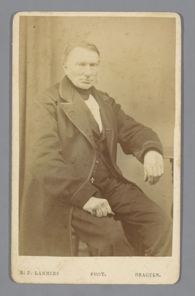 Curator: This captivating portrait, entitled "Portret van een onbekende man bij tafel" which translates to "Portrait of an Unknown Man at Table," was captured using the gelatin-silver print method sometime between 1870 and 1893, and the artist's name is Bernardus Petrus Rabels. Editor: He has kind of a…Melancholy air, don't you think? It's in the way he holds himself. Rigid posture, yet his hand just limply rests on his knee, like gravity is already winning. The lighting isn't helping! That sepia tone adds to this profound sense of longing. Curator: That posture likely wasn’t happenstance; during that era, maintaining a stern, almost stoic presence in portraits was perceived as portraying power, or the very least respectability. Even his attire–the dark suit and waistcoat–adheres to these formal conventions. Editor: And there he is sitting close to the edge of a fancy little chair, beside an ornate side table with a tasseled cloth on top, it suggests, in a sort of "keeping up appearances" way that reminds me of middle-class Dutch life during this period. He exudes an aura of resigned respectability; the man is literally sitting up straight, but the light isn't reaching his eyes, something's heavy in them. I'll call it disappointment with capital D. Curator: Well, gelatin-silver prints such as this provided incredibly detailed photographic renderings, and these techniques also served to promote realism and helped ensure an exact representation. As you suggested, portraiture acted as an aspirational device – in essence, people saw these not just as representation, but also as idealized images to enhance reputation. Editor: It is a really arresting image, it is a historical fingerprint that offers something profound about the sitter's relationship to his self-perception at the time. And isn’t it wild that what seemed staged then, feels like the most genuine thing to look at, decades after. Curator: Precisely, through a single image that aimed toward a sense of stiff “realism”, so much emerges; as cultural document, historical mirror and personal testimony – so complex.
