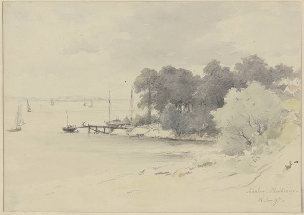Curator: What a tranquil scene. It’s a watercolor and ink drawing titled "Russian River Landscape," attributed to Johann Nepomuk Rauch, though it isn't definitively dated. Editor: It really evokes a feeling of serenity. The pale washes and delicate lines create a sense of hazy distance and stillness, it's almost dreamlike. Curator: Indeed. Rauch was painting during the Romantic period, so this kind of idyllic landscape reflected the era's sensibilities, emphasizing the awe of nature. This location, though possibly a generic, idealized view of a river in Russia, certainly taps into a romantic notion of rural life, somewhat divorced from any specific geopolitical reality. Editor: The composition really pulls the eye from that grassy bank in the lower right across to the clustered buildings at the painting's center. See how the reflection in the water cleverly anchors the structure into the scene. The brushstrokes feel incredibly loose and confident. It creates a real sense of atmosphere, though almost everything feels somewhat sketched and unresolved. Curator: The sketch-like quality emphasizes its character as something created "en plein air". It might represent a scene important within the Romantic period fascination with individual experience and personal communion with nature. Editor: Do you think there is also an almost wistful tone evoked by those soft color harmonies? The predominantly neutral hues, with touches of greens and browns, feel very contemplative and almost melancholic. Curator: Perhaps. Certainly a far cry from the realities of rural labor at the time! More likely an aspiration for connection to the land. It’s important to remember that representations of rural landscapes during this period frequently served as ideological statements, positioning rural simplicity in opposition to rapid urbanization and social change. Editor: That certainly lends an added layer of depth to its appeal, thinking about its role as an imagined counterpoint. The restraint really amplifies its expressive potential, giving so much scope for personal reverie. Curator: Precisely. Rauch's “Russian River Landscape” offers a moment of reflection on our shifting relationship to the land, then and now. Editor: Well, from a purely visual standpoint, I still marvel at how such subtle details create such a complete, emotionally evocative statement.