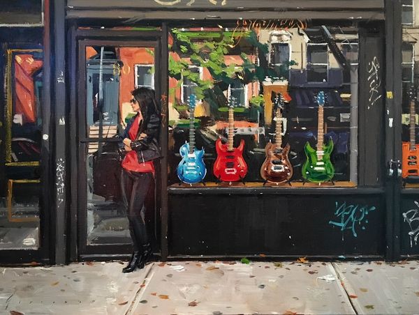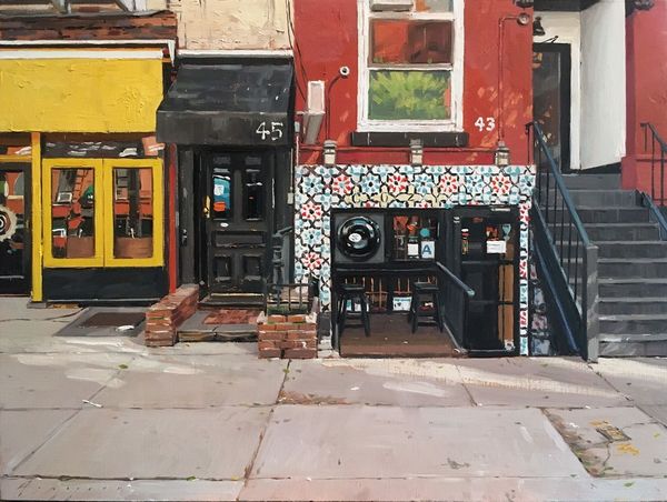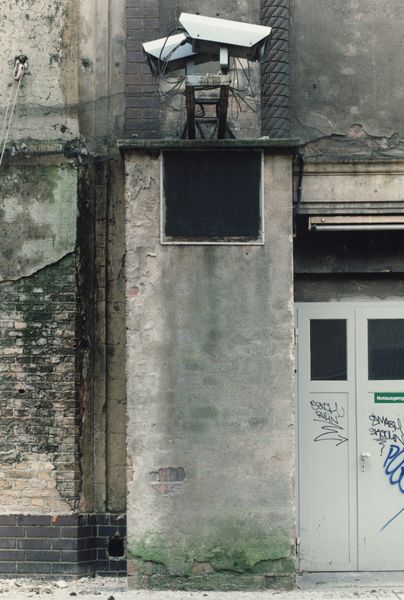 Curator: The first impression is overwhelming – layers upon layers. There's a dense accumulation of images and text; it almost feels like walking through a crowded street in the city. Editor: You’re right, a feast for the eyes. This is Vincent Giarrano's painting, "Basquiat's Studio on Great Jones Place." Giarrano captures the exterior of the building, turning it into a canvas reflecting the spirit of its former inhabitant. Curator: A spirit indeed, judging by the chaos. There is a certain rawness and unfiltered energy that’s reminiscent of Basquiat's own style. The tags and stickers create a palimpsest effect, with each layer telling its own story. Editor: That layering mirrors Basquiat's work in many ways, acting as a cultural record in progress. Giarrano uses that, and by representing this site so realistically, he's immortalizing a crucial aspect of New York’s art history. How do you think the medium, presumably acrylic, assists Giarrano’s concept? Curator: Acrylic lends itself well to this type of urban landscape; its versatility and vibrant colors allow for quick, layered application. You can replicate that immediate, impulsive feel of street art so important to Giarrano's vision, also contributing to the realism with its clean finish. Did this site possess a similar density to Giarrano’s painting, or did he manipulate it towards visual noise? Editor: Great question. Giarrano likely heightened the density. While the actual building undoubtedly bore some graffiti, the painting presents a hyper-real accumulation. He invites reflection on how we create artistic legacy and whether visual intensity amplifies meaning. Curator: It definitely complicates meaning! A single tag might be easily interpretable. The visual cacophony evokes urban experience itself - fragmented, fast-paced, and ever-changing, making it hard to draw any conclusions about either Giarrano or Basquiat’s project. Editor: Agreed, Giarrano seems intent on mirroring complexity. Well, whether celebrating or critiquing this legacy, this is a testament to art's continuous role in cultural dialog. Curator: Precisely! Giarrano opens doors to further examination about symbolism in place, identity and creative output in urban spheres.