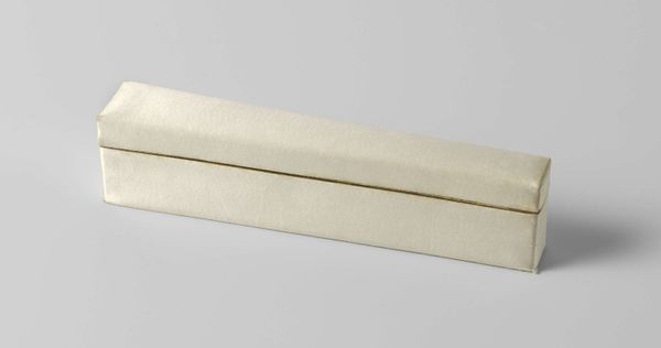 Editor: Here we have a fan box by Duvelleroy, likely crafted between 1900 and 1925. It's made of cardboard covered in white paper, with gilded edges. It seems so simple and understated. What significance could such an object hold? Curator: The simplicity is key, isn't it? Consider what a fan represented in that era – subtle communication, social status, even a secret language. The box isn’t just storage; it's a reliquary for those unspoken words. The white and gold reinforce this, hinting at purity and value. How does the box itself make you feel, knowing what it contained? Editor: I hadn’t thought about it that way. Knowing the box held a fan…it feels more precious, like it contains something of real emotional value, not just a material one. Does the specific choice of cardboard and paper speak to anything in particular? Curator: The cardboard hints at accessibility, perhaps a wider market than precious metals would allow. But the meticulous covering and gilding elevate it. It's a paradox. An everyday material given ceremonial importance, much like the unspoken social rituals it protected. What emotional association do you have to this "elevated" but humble, crafted object? Editor: I find that contrast really fascinating, how something seemingly ordinary can hold so much meaning and cultural weight. It kind of makes me think about how we assign value to objects today and the stories they tell about us. Curator: Precisely! It’s a beautiful echo across time. Seeing the gilded trimming, it evokes ideas and feelings connected to treasured moments of joy. It's cultural memory, continuing in visual symbols. Editor: I really appreciate how you connected the material to the social context and emotional significance. I definitely see this box in a new light now. Curator: And I found your personal reflection made me aware how this is more than cultural history—it is how personal memories are handed on.