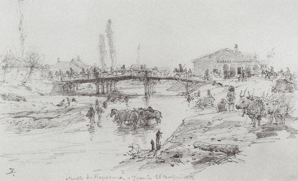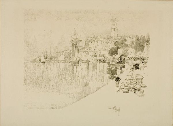 Editor: This is Joseph Pennell's "Munition Town," an etching from 1916. It looks like an industrial landscape, perhaps during wartime, but the airiness of the etching makes it strangely beautiful. What stands out to you about it? Curator: It’s crucial to consider the processes involved. Pennell’s choice of etching allows for incredible detail in representing the industrial processes that define the image. Think about the acid eating away at the metal plate, mirroring the corrosive effects of industrialization and war on society. Editor: That’s a really interesting connection! The way it captures the town – it makes you wonder what conditions the workers had to endure. Curator: Exactly! The scale of the factories, the relentless repetition of smokestacks... It speaks to the dehumanizing aspect of mass production and the war effort. How does the style relate to what you know about realism or even Art Nouveau? Editor: I see a tension. Realism in the subject, but Art Nouveau seems to show up in the sinuous lines of smoke and the almost decorative arrangement of the factories. Curator: Precisely! It wasn’t merely a depiction of reality, but a stylized commentary. The print was intended for consumption. This challenges us to consider not only the “what” but also the “how” and "for whom" of artistic production. Are we simply observers, or are we implicated in this system? Editor: I never considered that the making of art can itself be part of a political process. Thinking about how prints are made adds another layer to understanding this image. Thanks for shedding light on that. Curator: Indeed. Every mark on that plate represents labor, production, and a specific viewpoint, intertwined with the socio-political climate of its time. Understanding that is the first step.