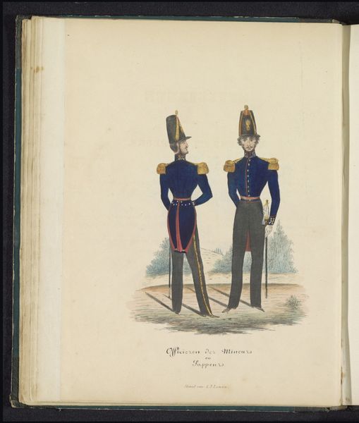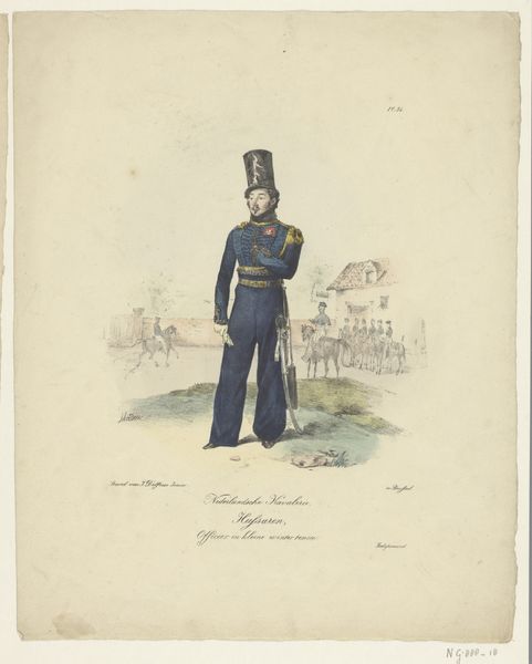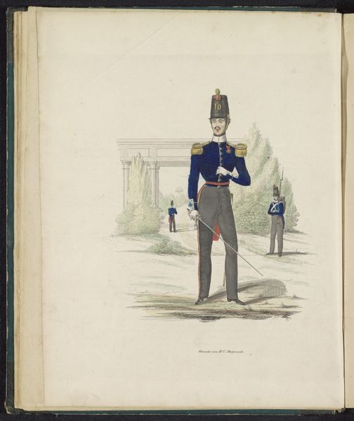 Editor: This watercolor illustration from 1845 by Louis Salomon Leman depicts a "Uniform for the Captains and Lieutenant Captains of the Navy". The formality of the subject matter really contrasts with the soft medium. What do you think makes this image compelling? Curator: Oh, I think it's the way Leman’s watercolor delicately balances precision with the flowing ease. Can’t you just feel the almost… hesitant optimism of the era through the captain’s stiff posture? Like a collective holding of breath before industrial revolution really hits the sails? It’s there in that meticulously painted uniform against a subtly undefined background. Editor: Optimism? I mainly picked up on the seriousness and attention to detail. I was also interested by how academic-art style can coexist with realism! Curator: But isn't that the fascinating bit? Think about it – academic art aimed to capture reality through a very specific, often idealized, lens. The realism here is of uniform specifications, rank insignia and posture. Almost a documentary approach embedded within an aesthetic frame. Do you think there's a tension between the actual, lived experience of naval life and its visual representation at the time? Editor: That's interesting, I hadn't thought of it that way. Maybe there is a performative aspect of power embedded in those layers! Curator: Exactly! And in watercolor illustrations it feels fragile and human and very unlike paintings done with oil on large canvases. Well, I feel I know a bit more about Naval officer’s life, now. Editor: Me too!