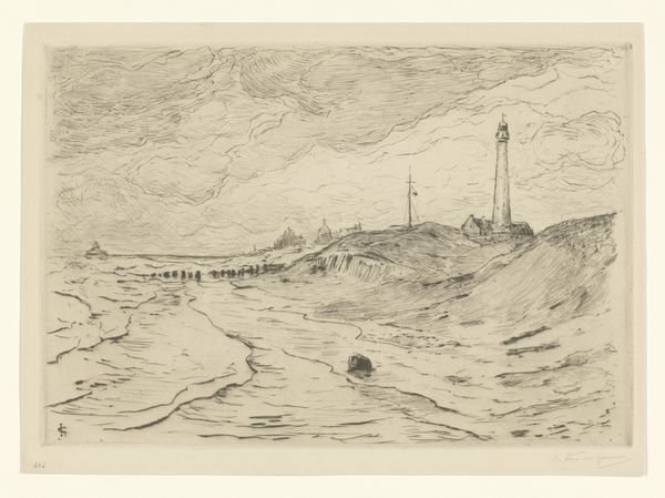Curator: Looking at this etching titled "Zeegezicht met golfbrekers bij Vlissingen," made by Carel Nicolaas Storm van 's-Gravesande between 1889 and 1902, I immediately feel a strong sense of starkness. Editor: Yes, there’s a somber quality, isn’t there? The limited tonal range really accentuates the play of light on the water, lending it a slightly melancholy mood. For me, the focus on Vlissingen also grounds it firmly in its geopolitical context; it reminds us of the reliance on maritime activity that marked so much of the Netherlands' history. Curator: Absolutely. And consider the visual vocabulary here. The sharp, angular lines used to depict the breakers, coupled with the relatively simple shapes defining the ships on the horizon, really guide the viewer's eye, don't they? Editor: They do. Storm van 's-Gravesande highlights humanity's vulnerability against the vast power of the sea. It's not merely a neutral portrayal, but it brings the ecological, social and economic circumstances together to create the total representation. Fishing and trading were very precarious ways of life in the era due to overfishing and unsafe vessels, not to mention its reliance on other empires who took advantage of native resources, so the artist also presents us with the class structure of the Dutch sea. Curator: I agree. There is the feeling that humanity is almost swallowed by nature in the piece, but look closely and you can see its mastery as well. The printmaking technique allows him to capture incredible detail within a constrained grayscale. But do you see the cultural elements here? Are you assuming, because the etching uses a realism art style, it fully encompasses every social condition for that timeframe? I think to call this commentary, not an exploration of line and perspective is the real claim to defend here. Editor: I'm more intrigued now than before, which means it was effective in some sense. Curator: And the light reflecting and refracting and the overall attention to geometric forms allows me to further contemplate on visual storytelling!