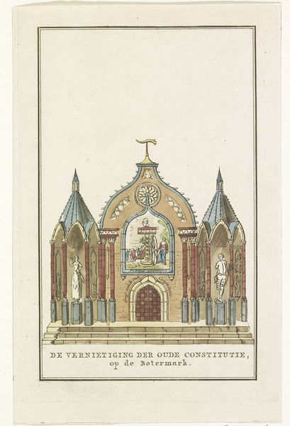 This watercolor drawing shows the decoration on the Botermarkt, or Butter Market, in 1795. It depicts the destruction of the old constitution in the Netherlands, marking a pivotal moment of political upheaval. We see a monument, adorned with classical motifs, built to celebrate the end of the old order. The central panel shows revolutionaries destroying symbols of the old constitution, while allegorical figures embody new virtues. This imagery reflects the revolutionary fervor sweeping across Europe, particularly after the French Revolution. It tells a story of radical change through visual codes. This work gives us insight into how the Dutch public processed the transition to a new political system. Investigating period pamphlets, newspapers, and civic records helps us to understand how the revolution played out on the ground. The drawing's visual language offers valuable material for understanding this key moment in Dutch history and the public role of art.