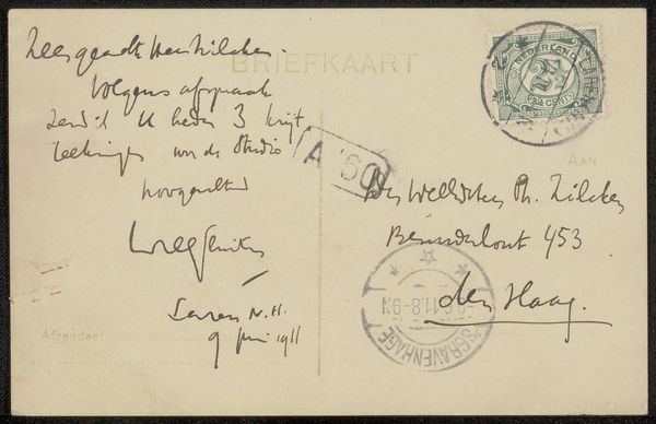 Editor: This is a fascinating little piece, titled "Briefkaart aan Philip Zilcken," possibly from between 1913 and 1918, by Willy Sluiter. It appears to be a postcard done in pen and ink on paper. What strikes me is the intimacy of it – it's like a peek into a personal correspondence. What do you see in it? Curator: I see a rich layering of social and historical context embedded in this seemingly simple postcard. Look at the hand-lettering, almost a calligraphic style, combined with impressionistic sketching. This merging of styles speaks to the artistic currents of the time, particularly the dialogue between modernism and more traditional forms of expression. But, even further, consider the act of sending a postcard itself during that period. Editor: What was so important about that? Curator: Postcards facilitated a new kind of mass communication but also reveal things about literacy, class, and access to networks of exchange in a rapidly changing world. How does the intimacy you sensed contrast with what you know of the sender, receiver, and what else was going on at that point in the early 20th Century? Editor: Right! World War I was brewing, and people were scattering and reconnecting, but it's almost mundane, capturing a moment in time amid global upheaval. So, something seemingly quotidian holds social importance? Curator: Precisely. By examining everyday objects, like this postcard, within their historical moment, we begin to uncover a deeper understanding of the past, seeing art as both a product of and a commentary on societal forces, from conflict to correspondence. Editor: It’s fascinating how something so small can reveal so much about the world around it. This card certainly speaks volumes once you start digging.