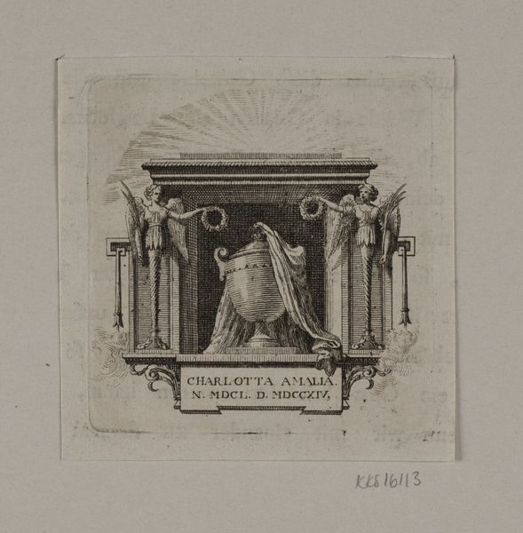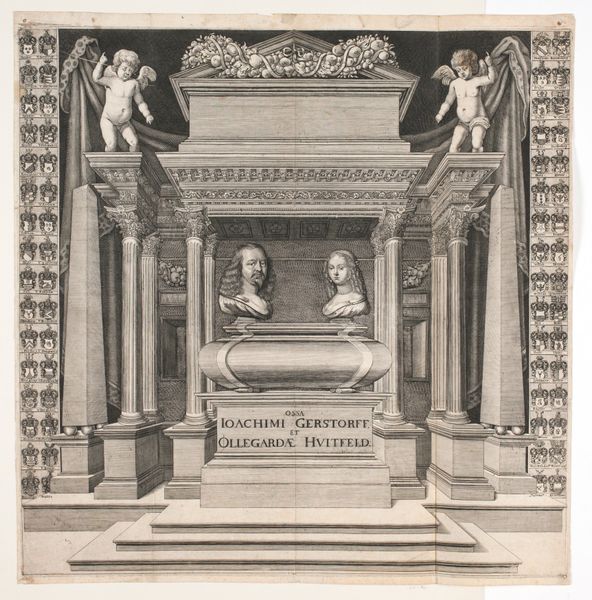 Jan Frederik Christiaan Reckleben created this print of the tomb of Johannes Polyander van Kerkhoven in the nineteenth century. The somber scene with its monochromatic palette evokes a feeling of reverence. The composition is structured around a strong horizontal axis formed by the tomb itself, which anchors the piece visually. Above, a dark, arched recess frames the scene, drawing the eye to the recumbent figure atop the tomb and the escutcheon above it. The figure's pose, reclining with head resting on hand, introduces a diagonal line that softens the otherwise rigid geometry. Reckleben’s use of engraving allows for meticulous detail, seen in the intricate folds of the figure’s drapery and the subtle gradations of shadow. This technique enhances the sense of depth and realism, inviting the viewer to contemplate themes of mortality and remembrance. The artist uses the semiotic language of funerary art to explore cultural attitudes toward death, inviting us to reconsider the visual and emotional codes embedded within such representations.