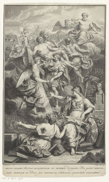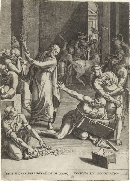 Editor: So, this is "Christ in Limbo, after Raphael," a print made in 1541 by Nicolas Beatrizet. Looking at it, the drama really strikes me. Christ is this beacon of light rescuing figures from a dark, almost cavernous space. What do you see in this piece? Curator: Oh, it grabs you, doesn't it? What I love is how it takes Raphael's Renaissance elegance and filters it through Beatrizet's engraver's hand. It becomes something new, almost raw. See how those stark lines create such intensity? I always imagine the printmaker, hunched over their plate, trying to capture that spiritual fire. The "Limbo" idea itself is fascinating too. It's this in-between space, a holding zone. Who do you think these figures are that Christ is liberating? Editor: It's... biblical, right? I see Adam and Eve, maybe some Old Testament prophets? They look so desperate, reaching for him. Curator: Exactly! And Beatrizet’s version highlights the tension. Are they being saved, or just glimpsing a fleeting hope? That heavy cross Christ carries - is it a symbol of triumph or a reminder of sacrifice? Maybe it’s both. The beauty of art is that it can be two different things at the same time, can’t it? Editor: That makes a lot of sense. I initially focused on the composition and forgot about the historical and cultural meaning! Now I see that Limbo is such a central element. Curator: Glad I could share my perspective. What did you think of my interpretation? Editor: It was an interesting take and helped me understand this image in greater depth, and contextualise it to give it much more value! Thanks!
