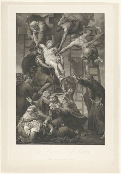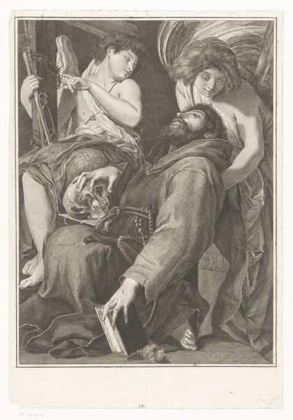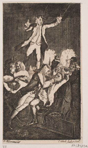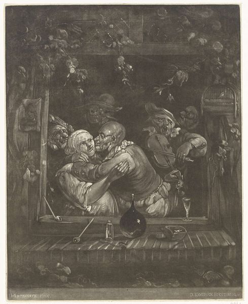 Editor: Charles Rambert's "Drunkenness," created in 1851, is a lithograph printed on paper. The drawing portrays what seems to be a personification of addiction, and it definitely gives off ominous vibes. What is your perspective on this somewhat haunting print? Curator: Oh, yes. It has that potent blend of Romanticism and moral allegory that was so popular in France at the time. Rambert plunges us into a shadowy world where the seduction of wine, if you will, is portrayed with a skeletal figure pouring from a seemingly bottomless vessel. He seems to embody the inevitability of decline, doesn't he? What do you make of the blindfolded figure? Editor: It's fascinating how the man seems to struggle against what looks like a skeletal figure, yet he's blindfolded – oblivious to the consequences. What does it tell you about the state of mind? Curator: I’d say that Rambert invites us to ponder about self-awareness versus self-destruction. That intoxicating blindness allows a dark aspect of our nature to take the steering wheel of our destiny. Look how he leads that winged creature onto ruin! How interesting that he used a lithograph medium... any ideas why? Editor: Maybe because printmaking allows to spread a social critique, to be publicly shared widely, don't you think? I will definitely look closer next time! Curator: Yes, definitely! These were potent warnings that permeated society. It seems Rambert struck a chord back then – and, arguably, still does today!