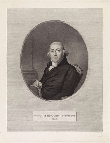 This is Jan Willem Caspari's "Portret van Simon Gerlof Broekman," an early 19th-century print. The oval composition immediately draws you into the sitter's gaze, framed by a muted palette that evokes a sense of serious contemplation. The portrait's formal structure relies on a play of geometric shapes. The oval containing Broekman is set against a rectangular backdrop, creating a dialogue between containment and expansion. The figure is positioned slightly off-center, which introduces a subtle tension, preventing the image from being rigidly symmetrical. The artist's technique, particularly in the rendering of light and shadow, adds depth and texture to the piece. The subtle gradations around Broekman's face and clothing are achieved through careful manipulation of the printmaking process. The detailed cross-hatching suggests an engagement with philosophical ideals by exploring new ways of thinking about representation. Ultimately, the print is not merely a likeness but a carefully constructed image that engages with broader cultural ideas about identity and representation. It serves as a reminder that art’s meaning is always evolving, shaped by both the artist's intentions and our own interpretations.