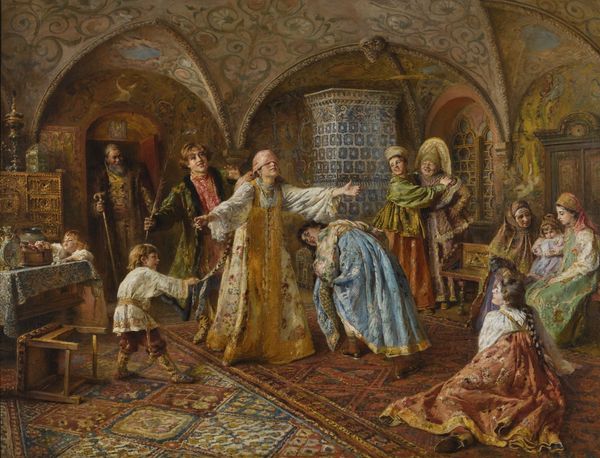 Wilhelm Kotarbinski painted this canvas depicting Prince Dmitry Pozharsky receiving Ambassadors in Moscow. It is a quintessential example of late 19th-century academic painting which sought to valorize Russian history. Kotarbinski, a Polish artist working in Russia, depicts a scene from the Time of Troubles in the early 17th century, a period of political and social upheaval. Pozharsky, a national hero, is shown here bedridden, yet still receiving dignitaries. This image speaks to the importance of leadership and duty, even in times of personal hardship. Note the rich colors and detailed rendering of costumes, reflecting the artist's academic training and the patron's desire for historical accuracy. The painting reflects the broader 19th-century trend of nation-building, where art was used to create a sense of shared identity and pride in the national past. By studying historical sources, costume books, and architectural records, we can understand how artists like Kotarbinski contributed to the construction of national narratives. We can appreciate how they served the political function of ennobling and solidifying existing social structures.