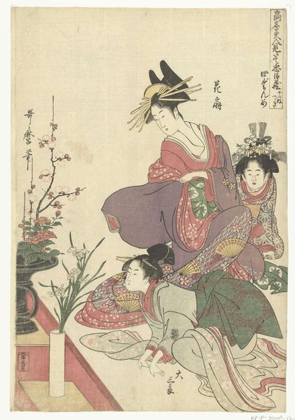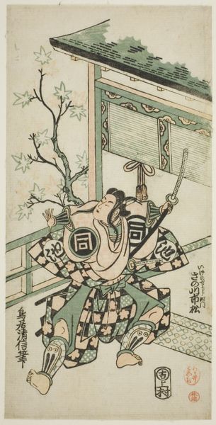 Curator: The work before us, entitled "Scene from a Drama: Ichimura Uzaemon as a Samurai", is attributed to Torii Kiyonobu I, crafted sometime between 1735 and 1755. This woodblock print offers a compelling glimpse into Ukiyo-e artistry and is currently housed at the Metropolitan Museum of Art. Editor: It strikes me immediately as poised and subtly melancholic. The vertical composition draws your eye upward, but the weight of the figures anchors it, and there’s a restricted color palette that imparts a certain serenity, doesn't it? Curator: Absolutely. Notice the prominence of line in this print. Kiyonobu's expert handling of line defines form and texture; observe the intricate details in the robes, from the repeating floral motifs to the sharper lines defining the samurai's stance. It is these aesthetic characteristics which lend the artwork its success in composition and dynamism, despite the muted colour scheme. Editor: Agreed, the pattern work is wonderfully complex, creating its own symbolic system. It’s as if their identities are being actively performed, and the context certainly supports this – actors, theater, illusion. It suggests an interesting point of cultural consumption at that time, right? How theatre and the representation of social types helped in negotiating emerging social codes, for both the powerful Samurai class, and their relationship with other levels of the complex, Japanese urban reality. Curator: Precisely. Ukiyo-e prints were pivotal in disseminating images of popular actors, effectively turning them into celebrities. This image does exactly this. Further analysis leads us to see the semiotic significance of this very setting - in this carefully considered, shallow space that amplifies our concentration on the human interplay. Even the window hints at confinement and artifice, amplifying the performative aspect of the characters' identities and of the picture itself. Editor: It feels as if this print becomes an artifact showcasing both aesthetic artistry and an important cultural function within its societal time frame. What I am particularly interested in is its use of the artifice to reinforce power. Curator: Precisely so, seeing the formal elements like line and color intertwined with their societal contexts helps the viewer begin to see the complete historical importance of this fine work. Editor: Yes, truly, by understanding the play of representation on display we glimpse past worlds brought carefully back to life.