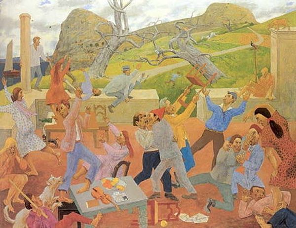 Dmitri Zhilinsky created this central part of a Triptych, using oil paint, and look at the texture he's achieved! It's like he's building the image out of tiny, deliberate strokes. The surface has a granular quality, almost like fresco, and those chalky, muted colors? They give the whole scene a dreamlike, slightly unsettling atmosphere, you know? I'm really drawn to the figure with his hands raised. There's a stark simplicity in the way he's rendered, yet he holds so much of the painting's emotional weight. It reminds me a bit of some of the stark interiors of Vilhelm Hammershoi but with a distinctly Russian sensibility. It’s not just about what we see, but how the artist makes us feel. Art is about the questions, not the answers.