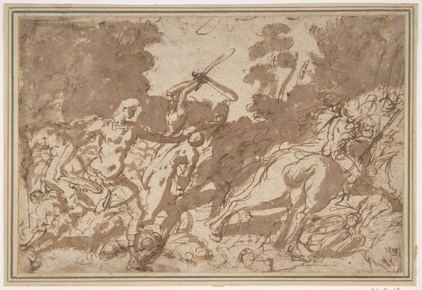 Curator: The drama is palpable, isn’t it? This drawing, "Pluto Abducting Persephone (recto)", from the 17th century, immediately conveys a sense of violent action. Editor: It's frenetic, yes, chaotic almost. Look at those rearing horses! The artist uses sepia ink in such a swirling, unrestrained way. What about the making of the dry-media drawing? What can you tell me? Curator: The dynamism certainly contributes to the baroque style of the artwork. Let’s situate it within its allegorical and historical context: we are witnessing Pluto, god of the underworld, seizing Persephone, a pivotal moment from classical mythology. The drawing exemplifies history painting. Her abduction represents a seizure of autonomy and female identity, so often present within mythological stories of possession and violence. How do we read it in the light of modern discourse? Editor: Very much. Well, from a materialist point of view, what stands out to me is the energy of the artist’s hand. The rough texture, the layering of strokes—they build this feeling of urgent activity. There's labor involved here: it's physical, almost performative. He works on drawing to create that chariot hurtling into the depths; we feel Pluto's raw authority but it lacks beauty! It underscores that something is wrong and highlights the brutal capture and loss of liberty. Curator: Absolutely. The medium and technique profoundly reinforce the themes of power and violation inherent in the narrative. You're drawing our attention not only to the classical story of Hades capturing Persephone but to the gendered power dynamics made raw and exposed. Perhaps now we, as modern viewers, ought to pause for thought and confront our own reactions. Editor: Well said. And thinking about materials and technique, hopefully that adds a deeper understanding of how the drawing came to life. Curator: I agree. Looking closely at art allows us not only to understand history, but our present and how art helps shape discourses on topics still present today.