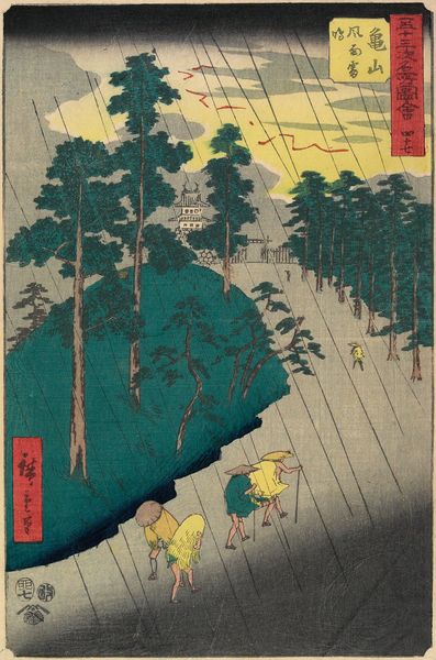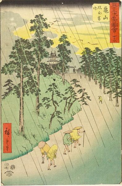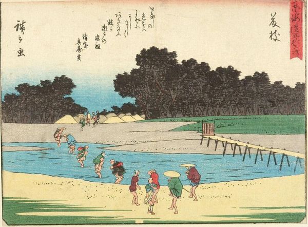 Curator: "Fukuroi" is the name of this captivating woodblock print by Utagawa Hiroshige, created around 1855. I'm struck immediately by its serene beauty and deceptively simple composition. What are your first impressions? Editor: My eyes keep going to the foreground. All that lovely pale-green water filled with orderly planted rice stalks makes me wonder about the laborers depicted doing this incredibly back-breaking work. Curator: The laborers are certainly a focal point. Consider, however, that this print is part of Hiroshige’s series “Fifty-Three Stations of the Tokaido," which connects the imperial capital of Kyoto to the shogun’s capital of Edo. So while laborers feature prominently, it functions as a narrative within a larger cultural geography. The kite, for instance, implies leisure even during labor. Editor: Exactly, who got to enjoy that kite? Was that pastime afforded to the workers in those flooded fields or the travelers up on that packed dirt path? Woodblock prints weren’t casually produced or inexpensive, and the dyes would need to be painstakingly layered, which begs the question of the audience. Curator: Certainly. And within this image are many smaller, humanizing allegories. Each traveler, each farmhand in their woven sun hats contributes to the grand allegory of work and leisure along the Tokaido highway. They tell the story of movement across the landscape of Japan, inviting viewers to locate themselves in that movement. Editor: Do you think the landscape informed Hiroshige’s method of production, or did his approach impact our contemporary perceptions of the landscape? It looks like these materials really lent themselves well to depicting that diffused light along the horizon line and the pooling water, like the medium inherently captures a misty day. Curator: Hiroshige's genius lies, in part, in his ability to blend precise detail with subtle atmosphere, conveying not just a location, but also a mood. This interplay speaks volumes about our human connection to the landscapes we inhabit and travel through. Editor: Seeing the human effort involved in the woodblock printing process, and how that resonates with those agricultural workers pictured, that resonates a lot, even today. Curator: Indeed, it speaks to our inherent ability to imbue the physical world with our internal landscape, emotions and collective stories.