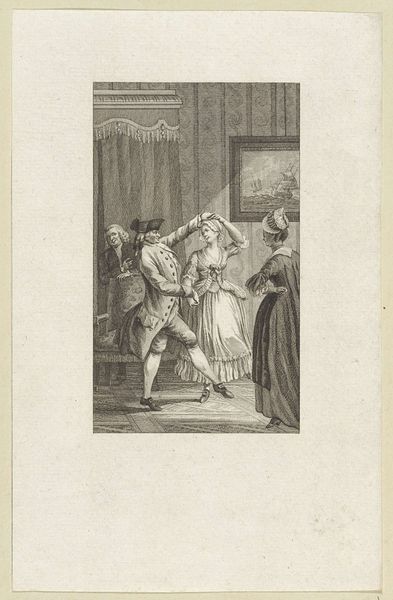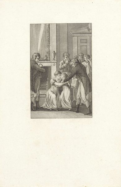 Reinier Vinkeles created this print of a domestic scene using etching and engraving. The interior setting and the figures’ dress and hairstyles place this image in the late 18th century. A woman kneels before an older woman, reaching out to a man who is either entering or trying to leave the room. The figures’ clothing suggests that they are members of the middle or upper class. Such prints were often made to illustrate popular novels or plays, and to be sold to a growing middle-class public that enjoyed seeing its own domestic life depicted in art. Prints like this one are not simply reflections of social life. They also helped shape social values. The figures represented in the image are meant to embody certain virtues or vices, and viewers are meant to learn from them. The question for the historian is to discover what kinds of values are being promoted, and how these values reflect the social and political concerns of the time. Art historical research, alongside a study of the literature of the period, would help us to more fully understand this image.