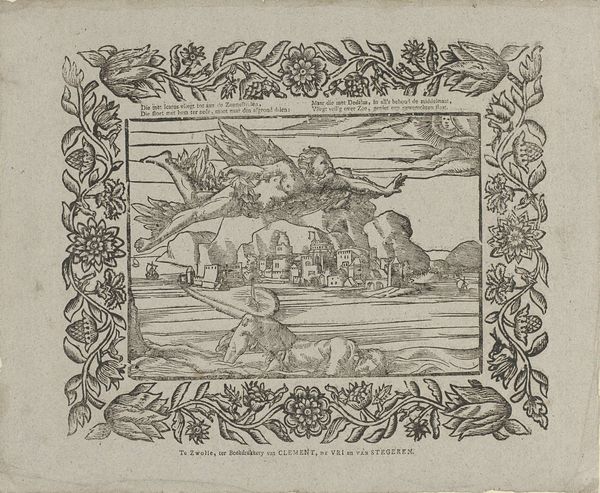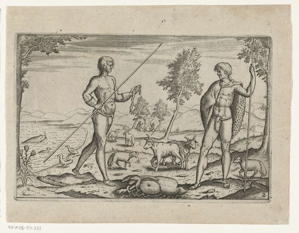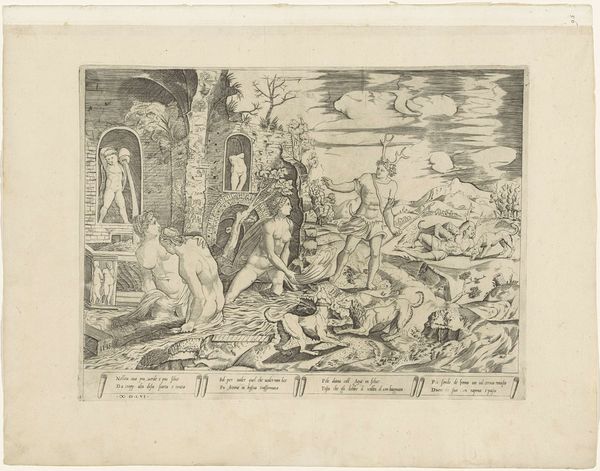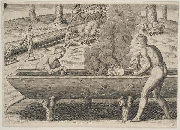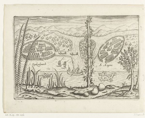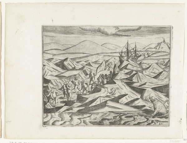 Editor: Here we have an engraving, *Schieten van de ijsbeer die twee zeelieden had aangevallen, 1595*, created between 1615 and 1617 by an anonymous artist. It’s currently held at the Rijksmuseum. It's quite dramatic, almost theatrical. What strikes you about the formal elements? Curator: Indeed. Considering the rigorous parameters of the engraving medium, I am particularly drawn to how the artist has articulated depth. Observe the meticulously rendered vessels in the background. The artist manipulates the size and clarity of these forms, crafting an illusion of recession. Further, consider the foreground where the figures interact. How do these linear arrangements inform the overall structure? Editor: It feels quite flat, doesn't it? The figures, especially the man shooting and the bear, are positioned almost in parallel planes. Does that flatness detract from its artistic merit? Curator: Not necessarily. The intentional flattening serves to highlight the key players within this deadly drama. The foregrounded elements, in conjunction with the linear patterns established by the fleet of ships, emphasize a consciously constructed arrangement. Note, also, the controlled deployment of light and shadow which models the primary figures against the less articulated forms and contributes an aesthetic contrast. What visual effect do you think this generates? Editor: It certainly pulls your eye toward the central conflict – the bear attack. The crisp lines and contrast make it all the more immediate. It’s a strong, if somewhat brutal, focal point. I'm beginning to see how the seeming flatness serves to intensify that. Curator: Precisely. By understanding the systematic composition and careful deployment of visual techniques, we see how formal elements enhance our comprehension and experience of the artwork. Editor: This has given me a new perspective on the intentionality behind artistic choices and how they direct the narrative. I’ll definitely be looking at the relationships between figures and background differently moving forward.