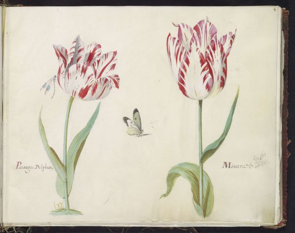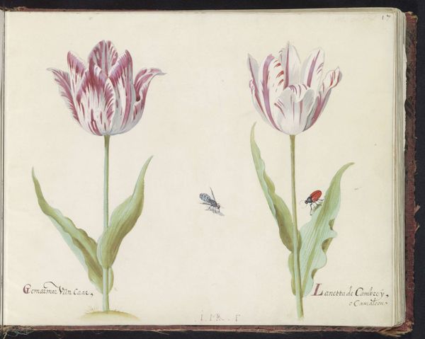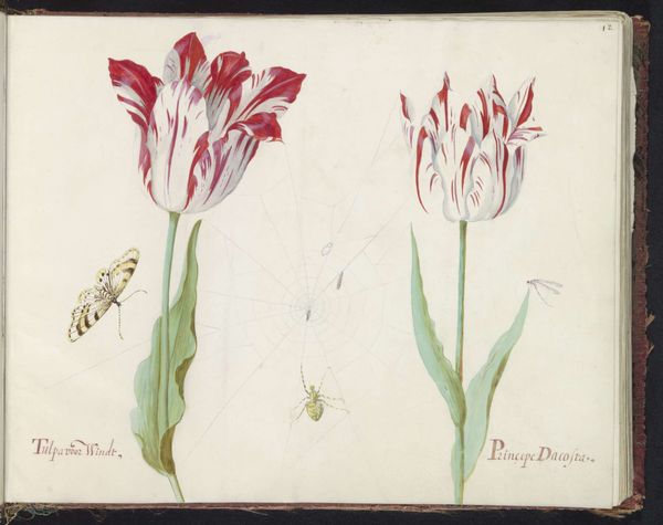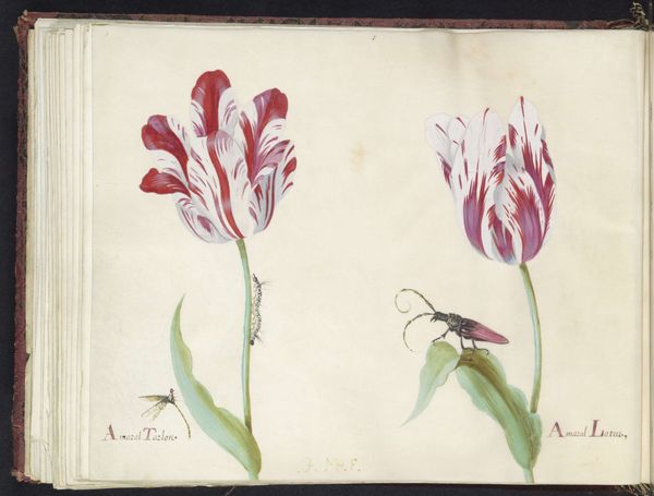 Curator: The delicate rendering of "Two Tulips with Fly, Dragonfly and Beetle" immediately struck me as joyful—almost playful in its composition. Editor: I see that, but I also note an intense scientific observation happening in this 1637 watercolour by Jacob Marrel, now held at the Rijksmuseum. Curator: Observation, yes, but hardly devoid of the symbolic weight these natural subjects would carry. We can't overlook that the tulip itself, during this period of Tulip Mania, became a loaded signifier of wealth and status. Editor: True, tulips in the Dutch Golden Age became implicated in wild economic speculation; these specific tulips actually denote certain types in that market. But consider the seemingly casual arrangement. Doesn't it propose a particular scientific ambition as well, with the artist paying scrupulous attention to details of the insects? It's a very studied realism that seeks to depict life. Curator: I would say it aims to classify it! Note the stark background and isolated arrangement. There’s a clear visual link to the tradition of the emblem book, which also relies on clarity and symbolism, in this case referencing a fascination and moral quandary about material riches. Look at that little fly on the one flower… a small mark on something exquisite but fleeting. Editor: Intriguing point, but can't that "mark" be viewed as further testament to his observation skills? The overall impact emphasizes nature, but what did this actually mean within the broader socio-economic landscape of the 17th Century Netherlands? What was the relationship of these detailed botanical works to the development of global trade? Curator: Global trade, botanical art… All visual systems interacting and reshaping each other in fascinating ways, no? Thank you for pointing me towards some relevant details about economic issues within the work, as well! Editor: It's a complex bloom and image, this Marrel piece; each level, each mark making us ask fresh questions about observation and symbolism of the world around.
