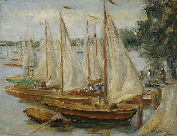 Editor: Here we have "Yachts at Royan," created by Odilon Redon in 1902, believed to be in pastel. It has such a dreamlike, hazy quality; what strikes you most about its composition? Curator: Initially, I’m drawn to Redon’s command of form and the subversion of traditional representational strategies. Observe how the masts of the yachts, rendered with delicate lines, pierce the composition. Editor: They really do draw the eye upwards! Almost like musical notations, reaching for a higher register. Curator: Precisely. Note also how the application of pastel is far from descriptive; it is, rather, a deployment of color to invoke feeling. Do you perceive a deliberate use of dissonance in the color choices? Editor: I see a subtle clash between the warmth of the sails and the coolness of the water and sky. It gives it some tension, which is interesting. Is that intended to evoke…discomfort? Curator: Not necessarily discomfort, but perhaps a deliberate ambiguity. The interplay of light and shadow suggests a fleeting moment. Notice how Redon’s use of broken color lends itself to a surface rife with nuanced texture and visual intrigue. Does this reading impact your initial perception? Editor: Absolutely, focusing on the colors and the construction adds to that dreamy effect. The tension almost dissolves into the beauty of it all. Curator: Indeed. By foregrounding the materiality of the medium and challenging representational norms, Redon invites us to engage in an aesthetic experience rooted in visual analysis. Editor: That's really helpful! It’s amazing how much can be communicated by color and form. Curator: Indeed. Through such close visual scrutiny, the work yields endless interpretations.