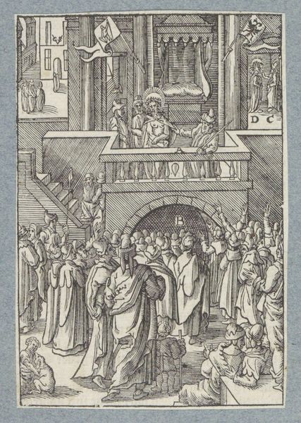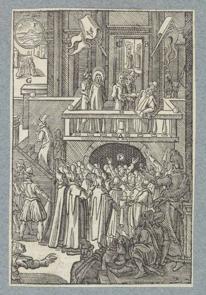 Curator: This detailed engraving, created by Bernard Picart in 1732, is titled "Installatie van nieuwe predikanten, catechisatie en biecht bij de lutheranen in Augsburg." It offers a fascinating glimpse into Lutheran religious practices. Editor: My first impression is the stark linearity of the piece; the composition feels rigidly organized into discrete compartments. It reminds me of a meticulously crafted textile sample, albeit rendered through engraving rather than weaving or embroidery. Curator: The linear style really serves to present each vignette clearly. Each panel portrays a different aspect of Lutheran ministry—installation of ministers, catechesis, confession, and absolution—reflecting the social and institutional structures of religious life in Augsburg. It's almost a journalistic approach, recording these events for public understanding. Editor: And what tools would have been used in its creation? It is amazing how much details this small engraving depicts! Can you elaborate on Picart’s engagement with materials and production here? It speaks to the level of skill required for engraving—each line carefully etched. The prints produced from it would circulate, acting as a vital visual record for the wider populace, reinforcing the practices of faith, while serving commercial function as well, sold for a small profit. Curator: Precisely. Prints like this one circulated widely, informing public perception. Picart, and indeed printmaking in general, played a significant role in disseminating information and shaping public discourse during this era, solidifying institutions and traditions, like the Lutheran Church of Augsburg, within the broader cultural landscape. Editor: I also wonder about the social implications of each scene. For example, the confession booth almost resembles a confessional stall; considering that Lutherans broke from the Catholic Church a century prior, I imagine how this return to Catholic conventions may affect how one thinks of labor, materials and consumption that the parishioners put toward creating, visiting and utilizing this confessional stall. Curator: That's an insightful point about the confession. Indeed, this representation provides a tangible insight into how confessional spaces might also create new traditions in practice or reception of ministry! Editor: Looking closer, this detailed "textile," as I call it, reveals the labor and social context woven into its creation; it certainly reshapes my understanding of faith and practice in 18th-century Augsburg. Curator: For me, it underscores the role of art in constructing and conveying social narratives within a specific historical and religious context.