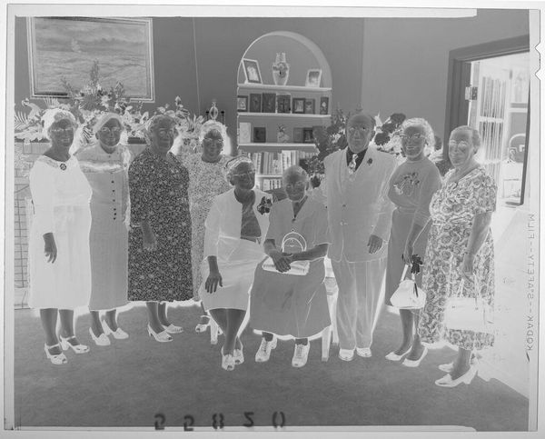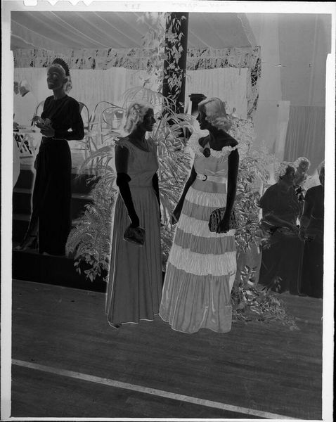 Editor: Here we have an untitled photograph by Jack Gould, showing four women in floral hats. It has an intriguing, almost theatrical quality. What do you see in this image? Curator: The hats, seemingly frivolous, become a point of departure. Consider the social history of women and fashion: Are these hats expressions of individual agency or conformity to societal expectations? Editor: That's a good question! Curator: This image prompts us to consider the performance of identity, especially for women. What narratives do these clothes and objects create, and how do they challenge or reinforce existing power structures? Editor: I hadn't thought about the hats as anything other than decorative before! Curator: Exactly. Art can open up new pathways for how we contextualize gender and status.